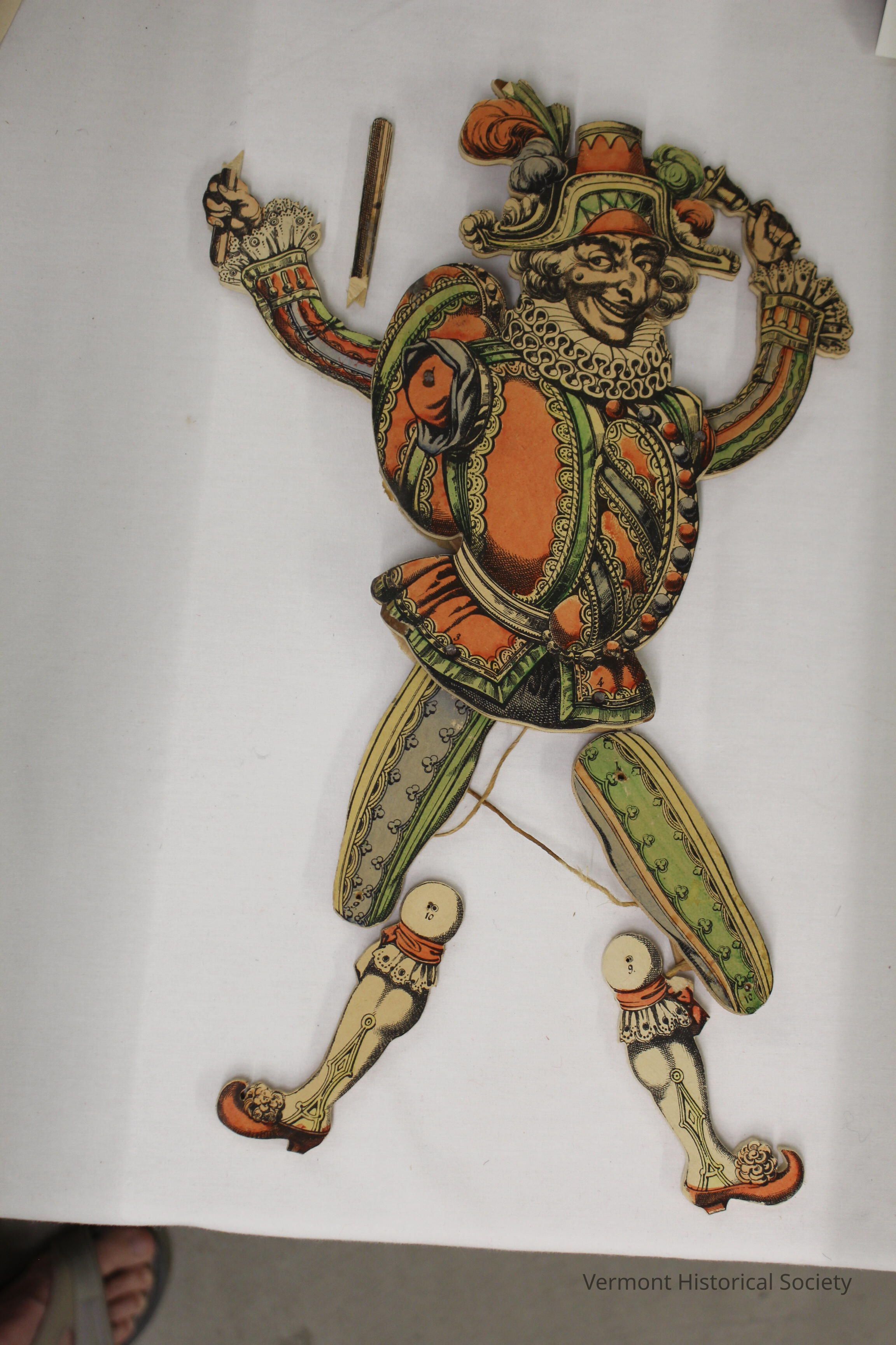Facily dressed man with alaborate hat with pumes, tall collar, orange jacket with gree, gold and black decoration, green, gray and yellow knee-length pans, heeled shoes with flowers. the legs have detached and the stick he was holding in his right hand has broken.Context