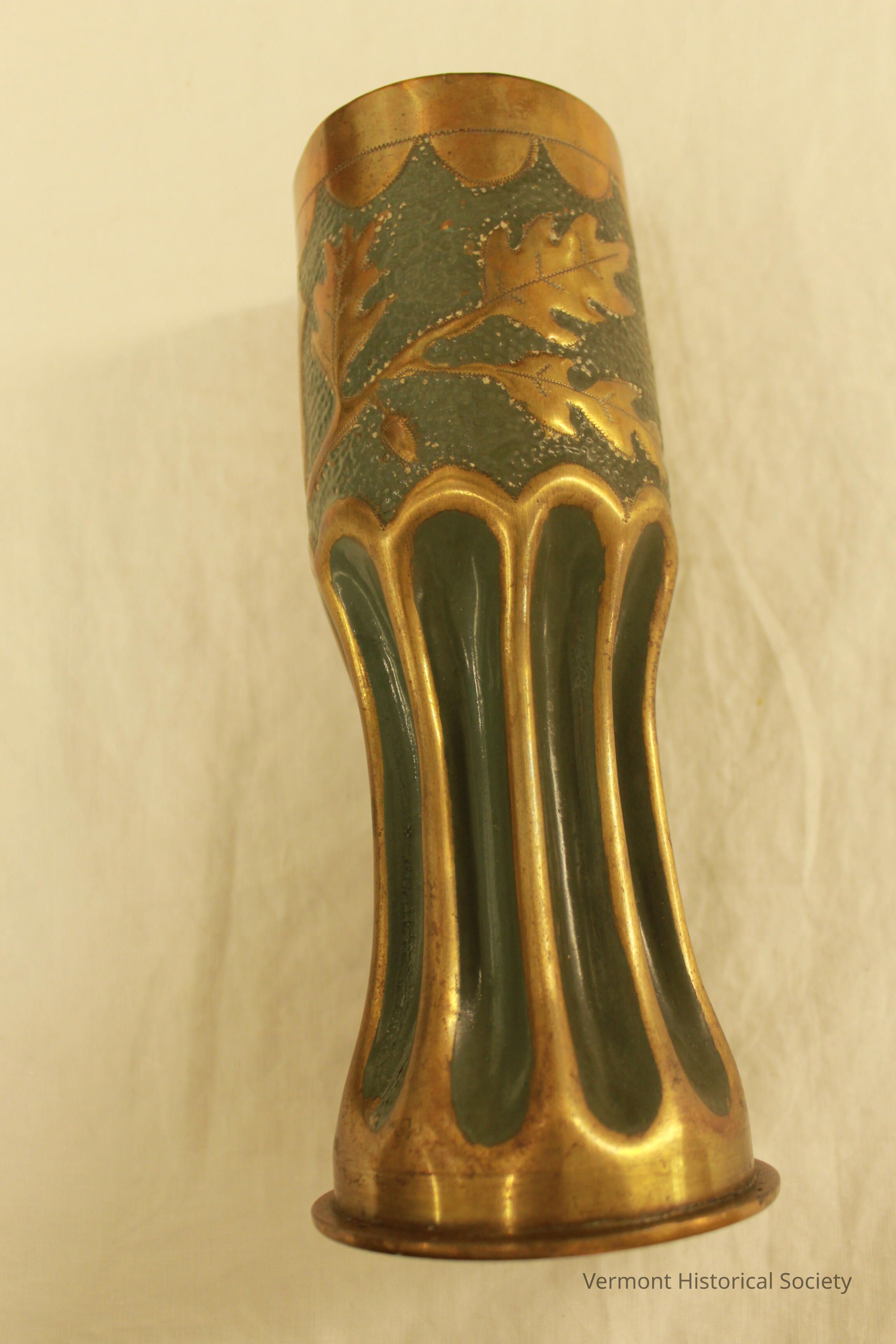 A vase constructed from a green World War I artillery shell. The top half of the vase has gold scalloping at the top and a gold oak leaf branch beneath it. Beside the branch is a shield with the word "souvenir" etched into it. The bottom half has vertical concave fluting and the same gold outlining the ridges of the vase. The underside of the base is dated "Sept. 1917."Context
