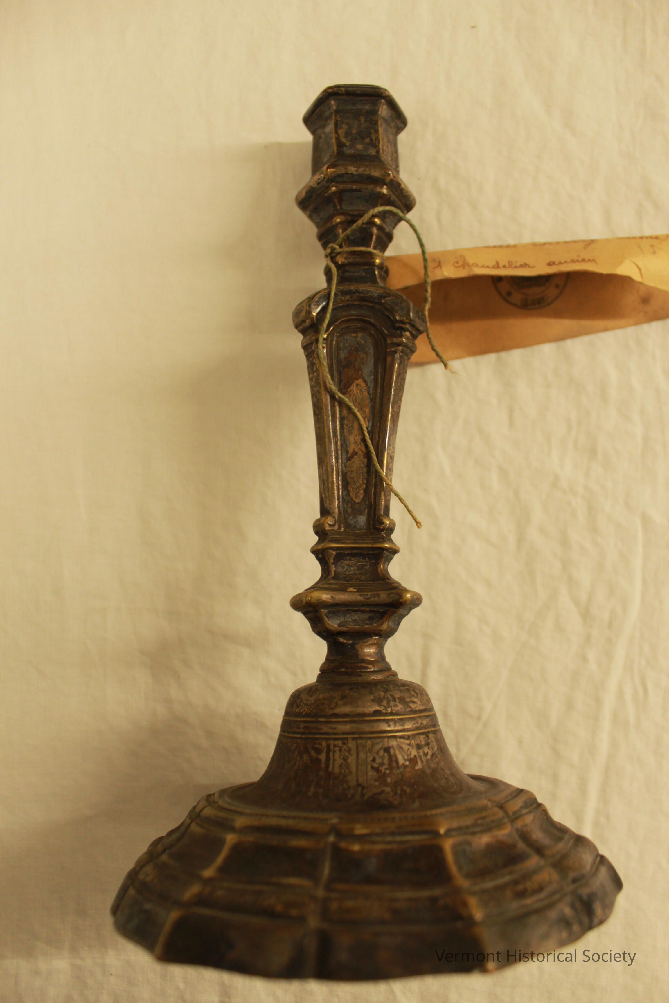 Ornate, tarnished brass candlestick with tag that says it is "ancien," meaning an antique from Chateau-Thierry.