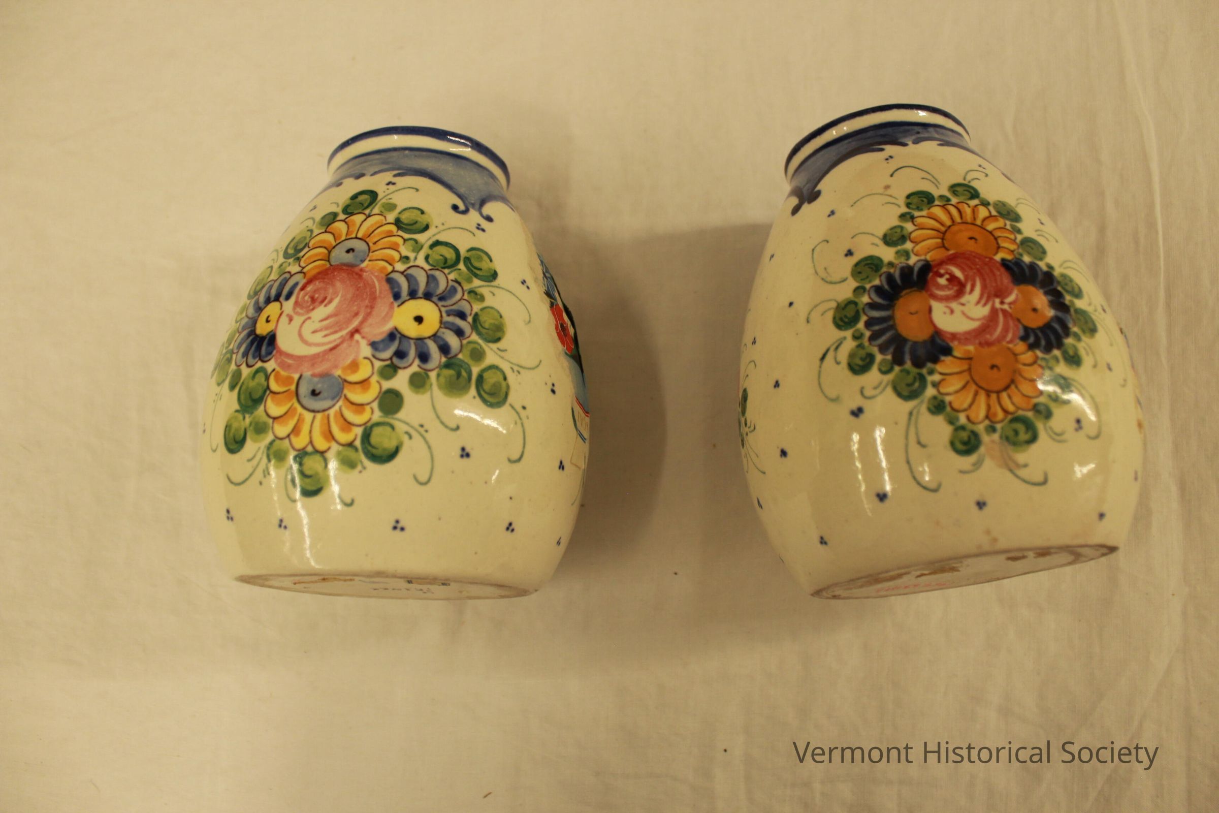 A pair of cream and blue floral vases with tags inside that say they are from a girls school.