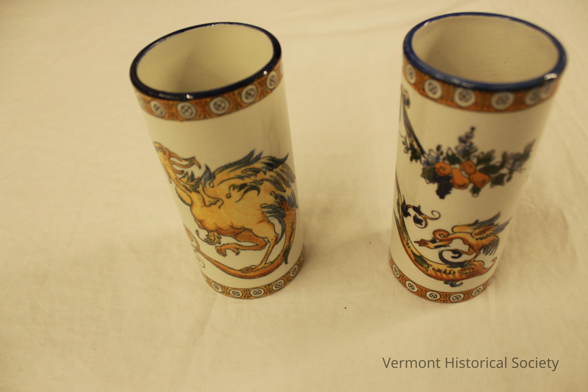 Pair of cylindrical vases, wcream with blue rims. Coat of arms with figure in the middle, fruit at the top and fish at the bottom. Opposite sides of the vases are different, with one having a big yellow dragon and the other a fruit and vine design.