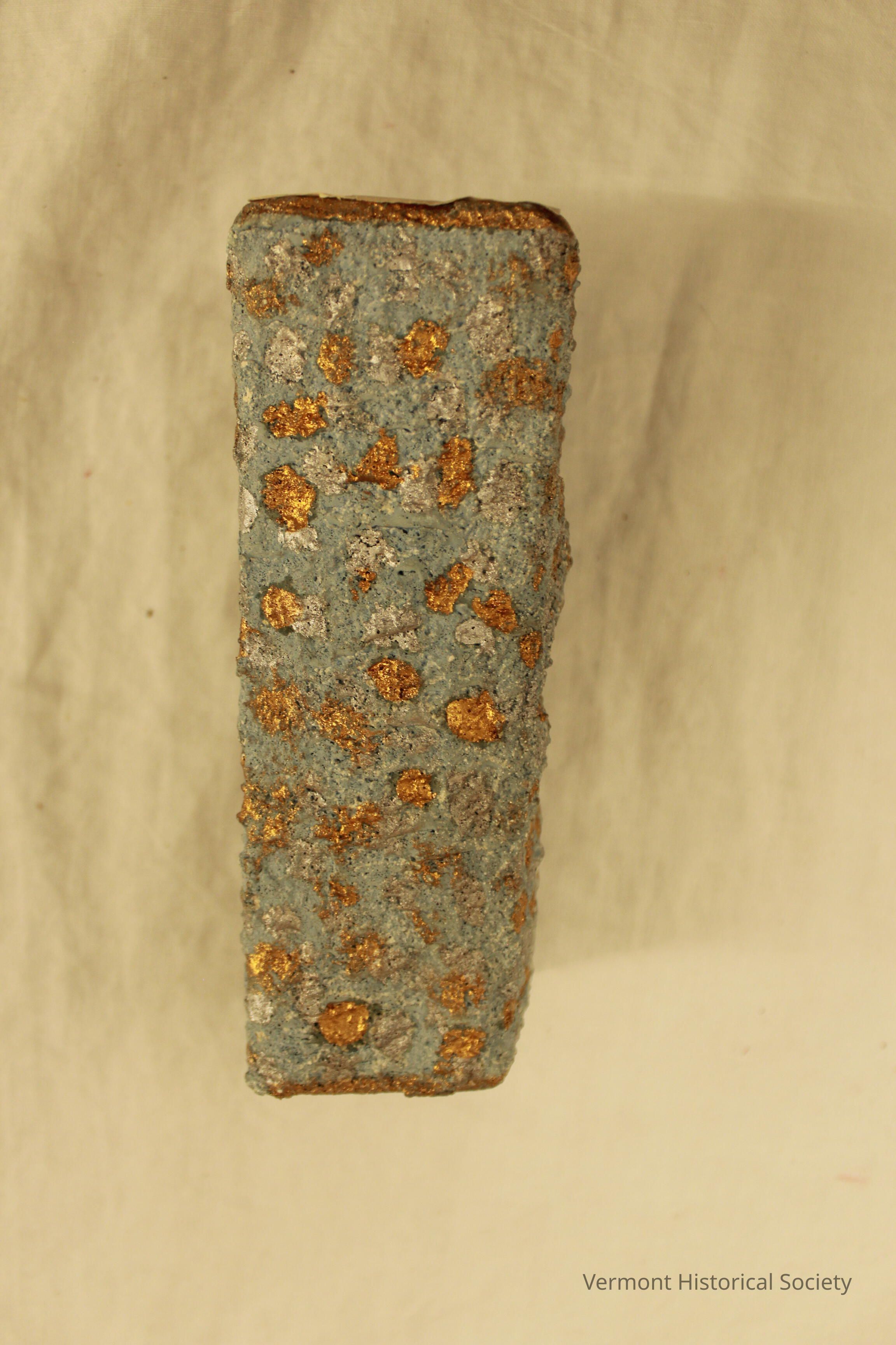 Box-shaped papier mache vase made by children at the College Moderne et Technique in Montceau Les Mines. Vase has a greenish, gray background, nubbly surface and is speckled with gold and silver paint.