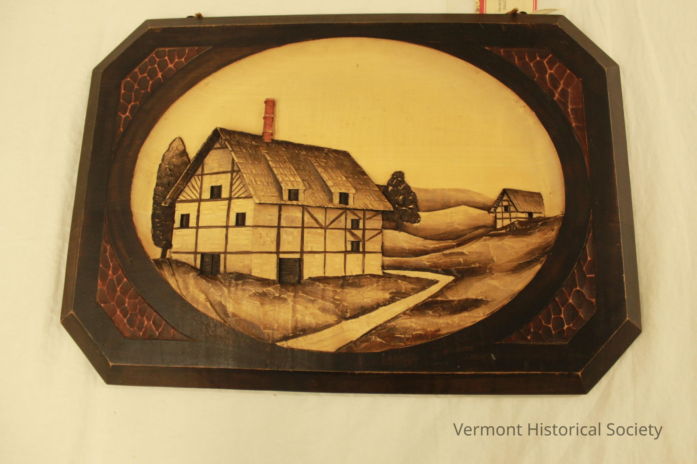 A carved and wood-burned plaque showing two Tudor-style country houses within rolling hills.