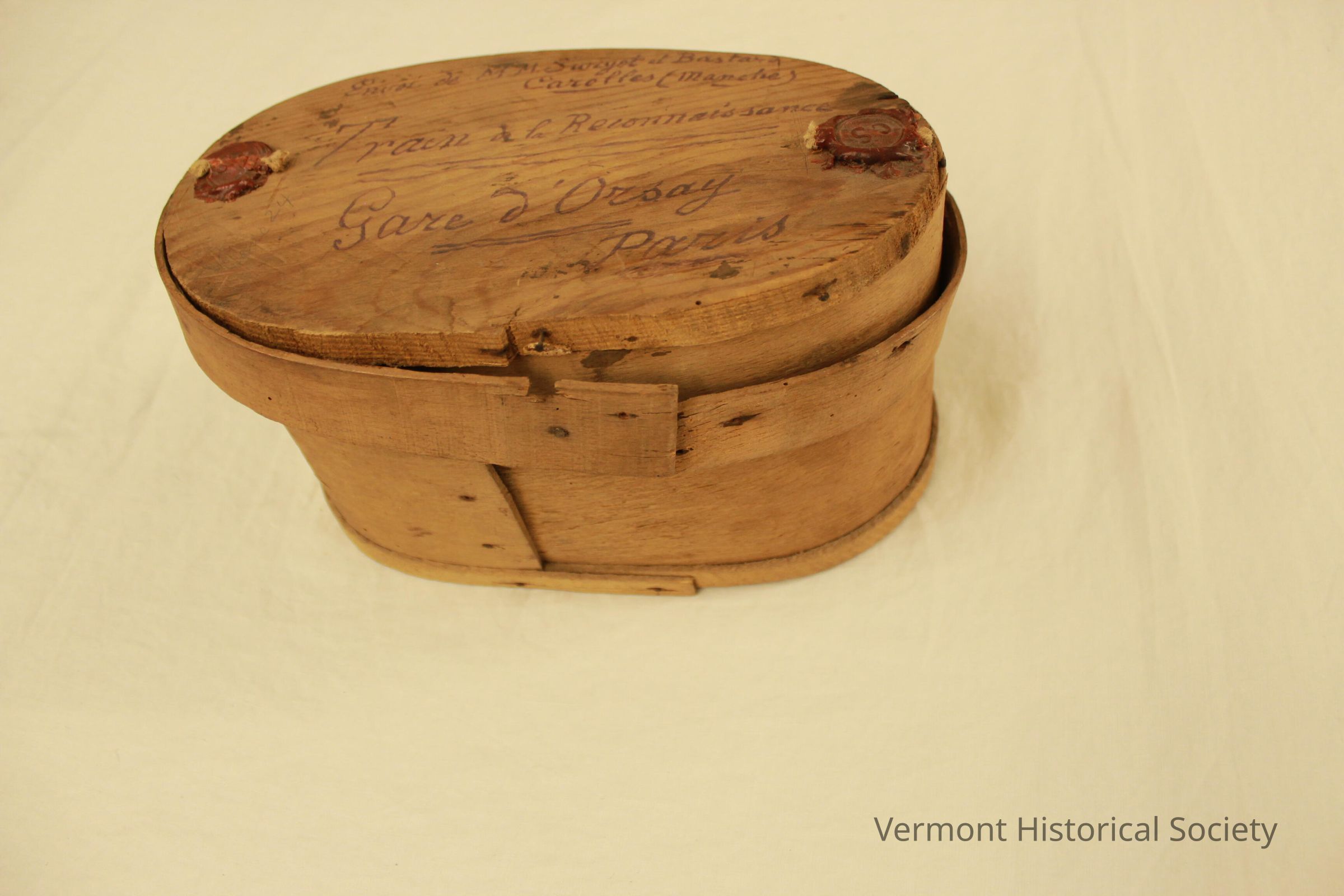 Wooden bandbox with lid that comes off. Writing on the top says it was sent by a couple from Carolles, which is located on the northern coast of France. The lid has come apart.