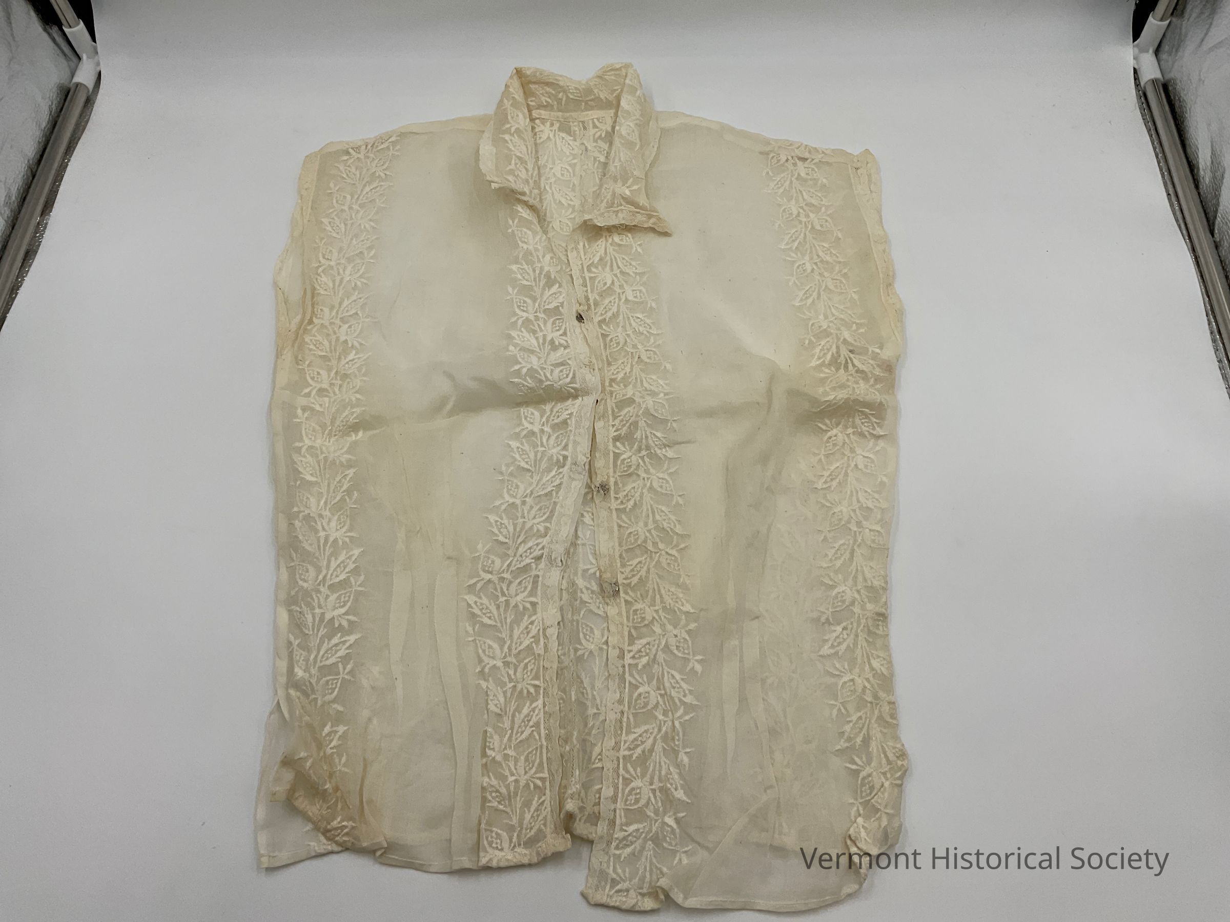Sheer white cotton blouse. It has a pointed falling collar and no sleeves. It is embroidered along the center front opening and the side seams with a floral vine in white. The center front fastens closed with metal snaps.