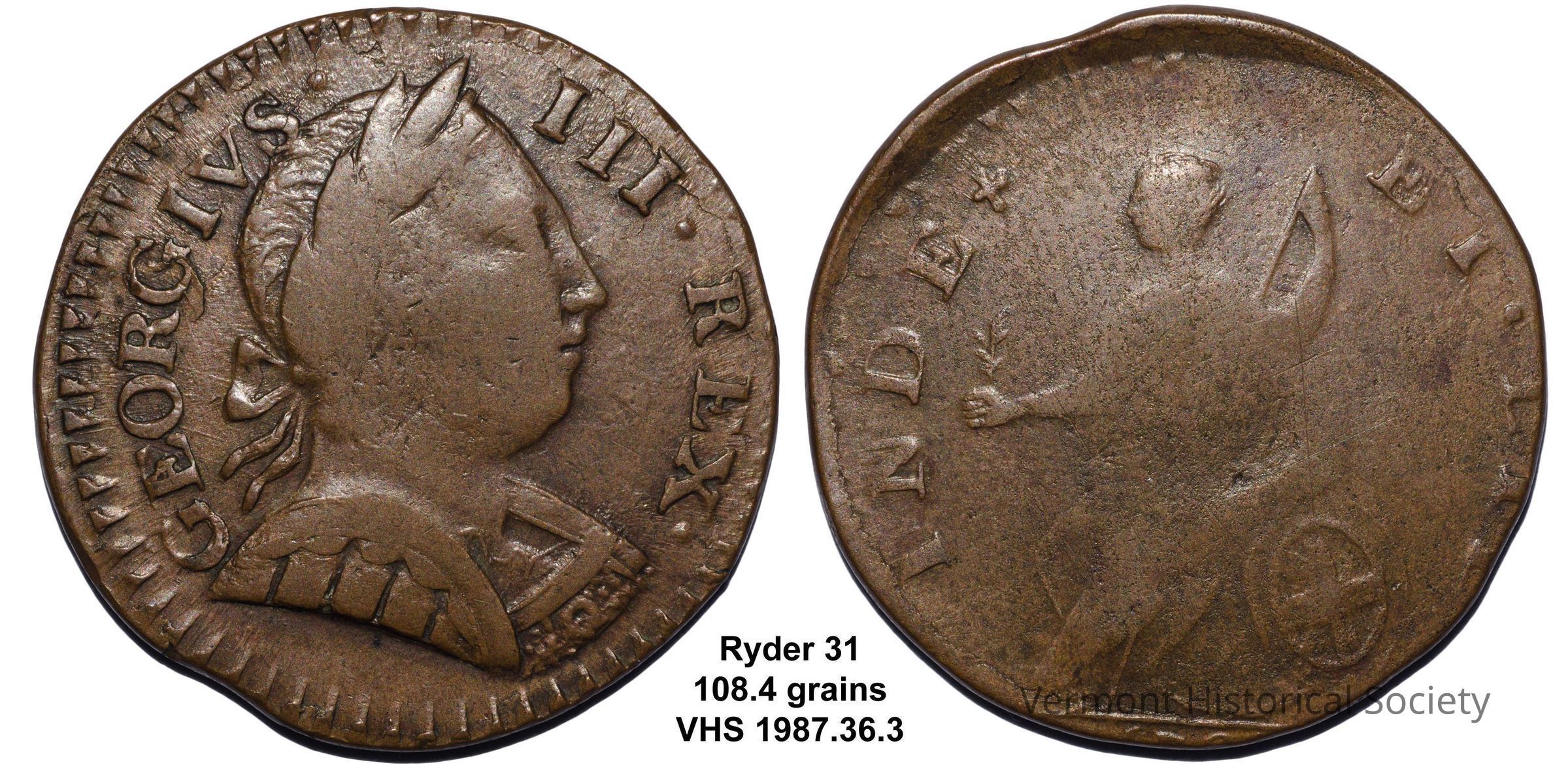 Copper coin with a bust on one side and the allegorical figure, Columbia, on the other. The face side shows a right-facing bust of a Roman figure, wearing a laurel wreath on his head, tied with a ribbon at the nape of his neck, and military armor. The words "GEORGIVS III REX" ring the edge. On the reverse, Columbia is shown swathed in loose fabric, seated next to a shield bearing the Union flag. She is holding a staff with a liberty cap in her left hand, and a small branch in her right hand. The words, "INDE ET LIB" ring the edge. The figure is rubbed nearly smooth.Context