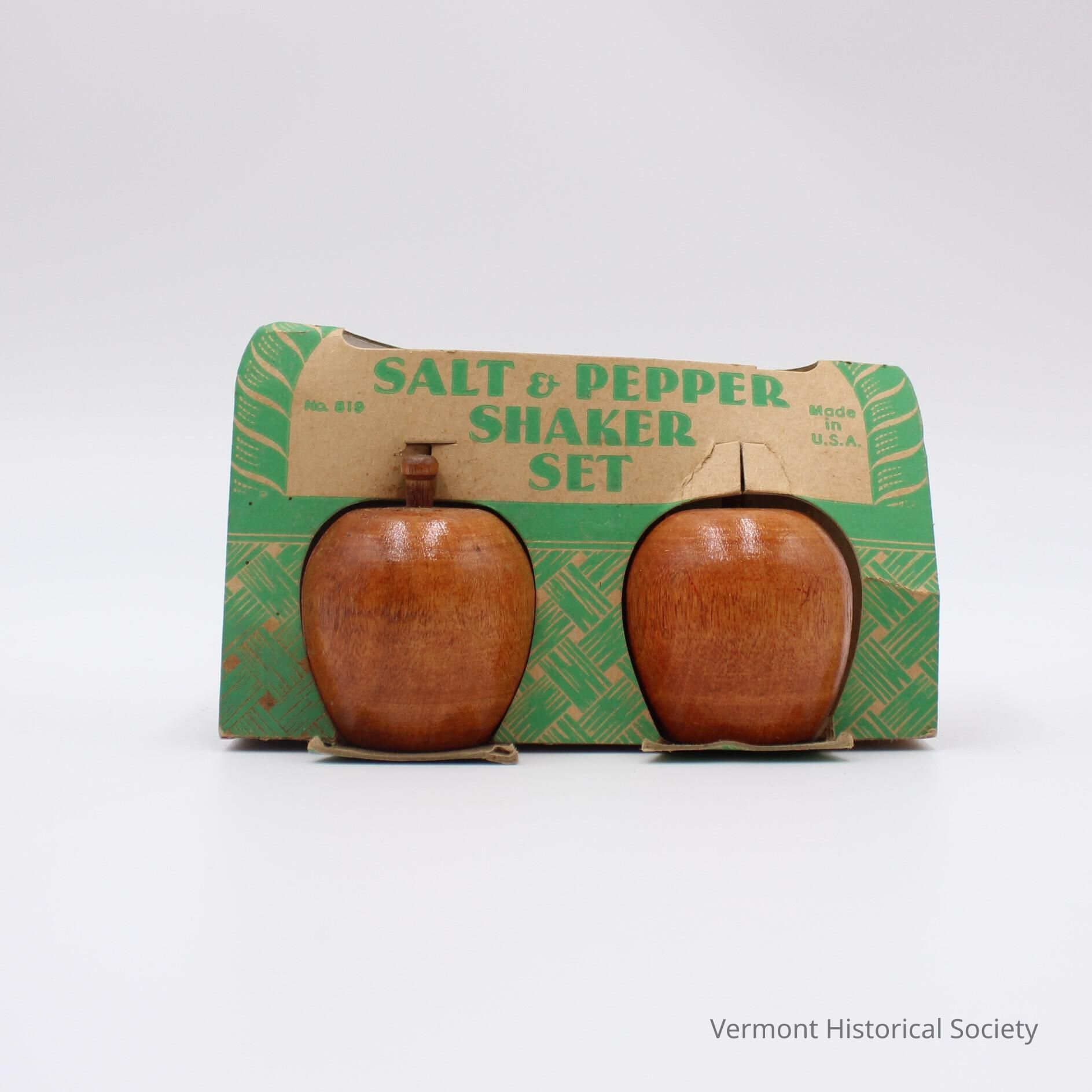 Salt and pepper shaker set consisting of two turned wooden shakers in the shape of apples. The shakers are in their original retail packaging: a shaped cardboard holder printed with the label, "SALT & PEPPER SHAKER SET".
