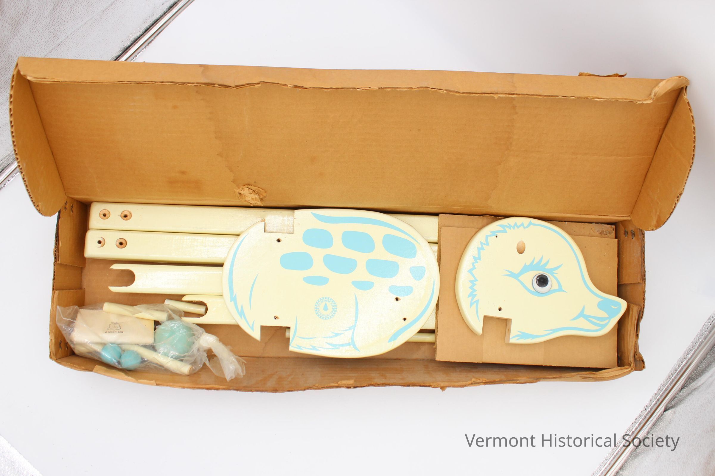 Clothing rack set in the shape of a fawn. The rack is disassembled, but includes a head, two ears, a long neck, a body, a tail, and three long legs. The pieces are in the original box and accompanied by the assembly instructions. The box is printed with the label, "#303 FAWN TRAINING CLOTHES RACK NEWTON AND THOMPSON, INC. BRANDON, VERMONT / BLUE".Context