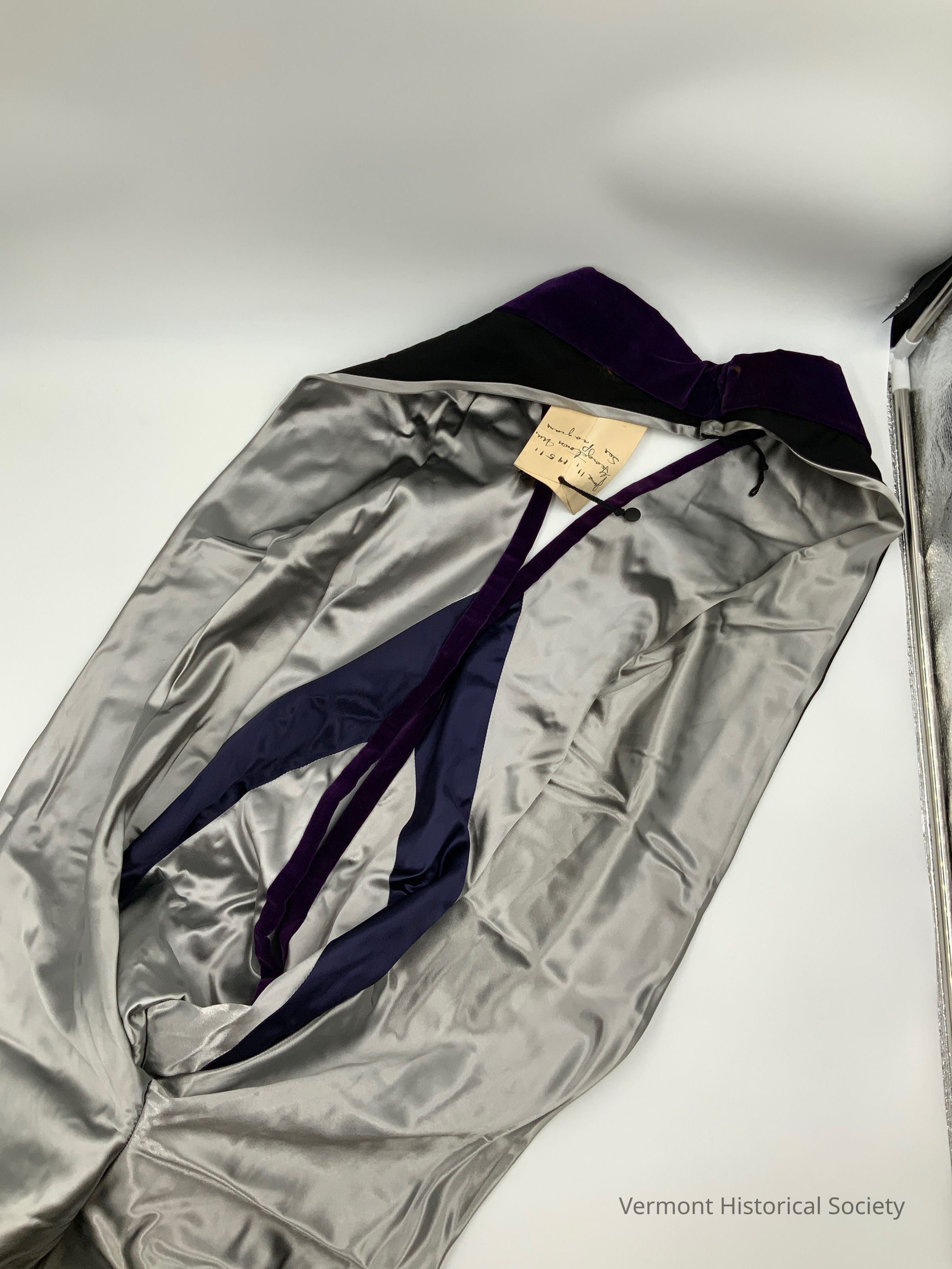 Academic hood. The outer fabric is black, and the lining is silver with a blue stripe. The opening edge is bound with black velvet.