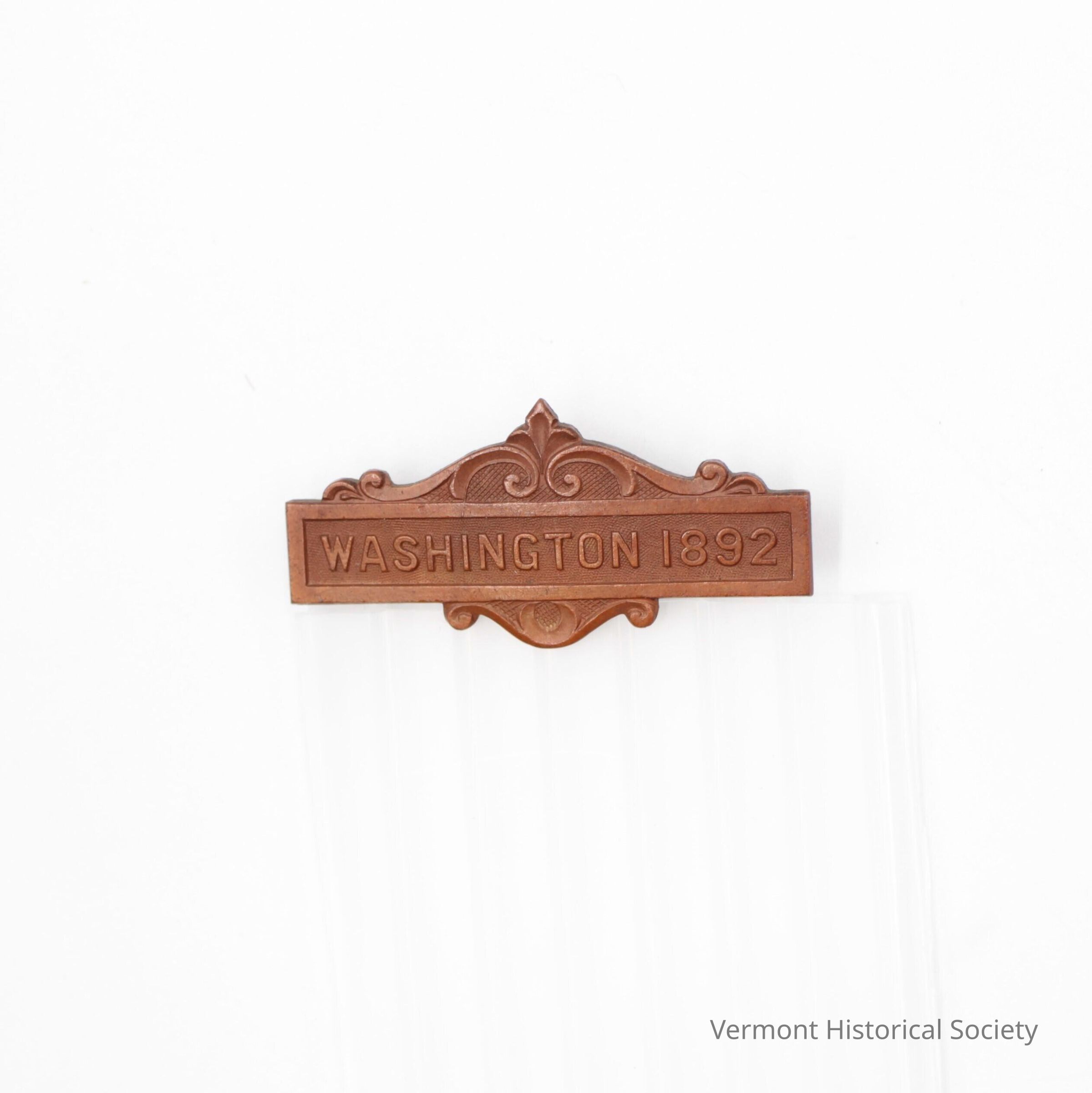 Bronze bar pin with decorative scrollwork at the top and bottom and the inscription, "WASHINGTON 1892".