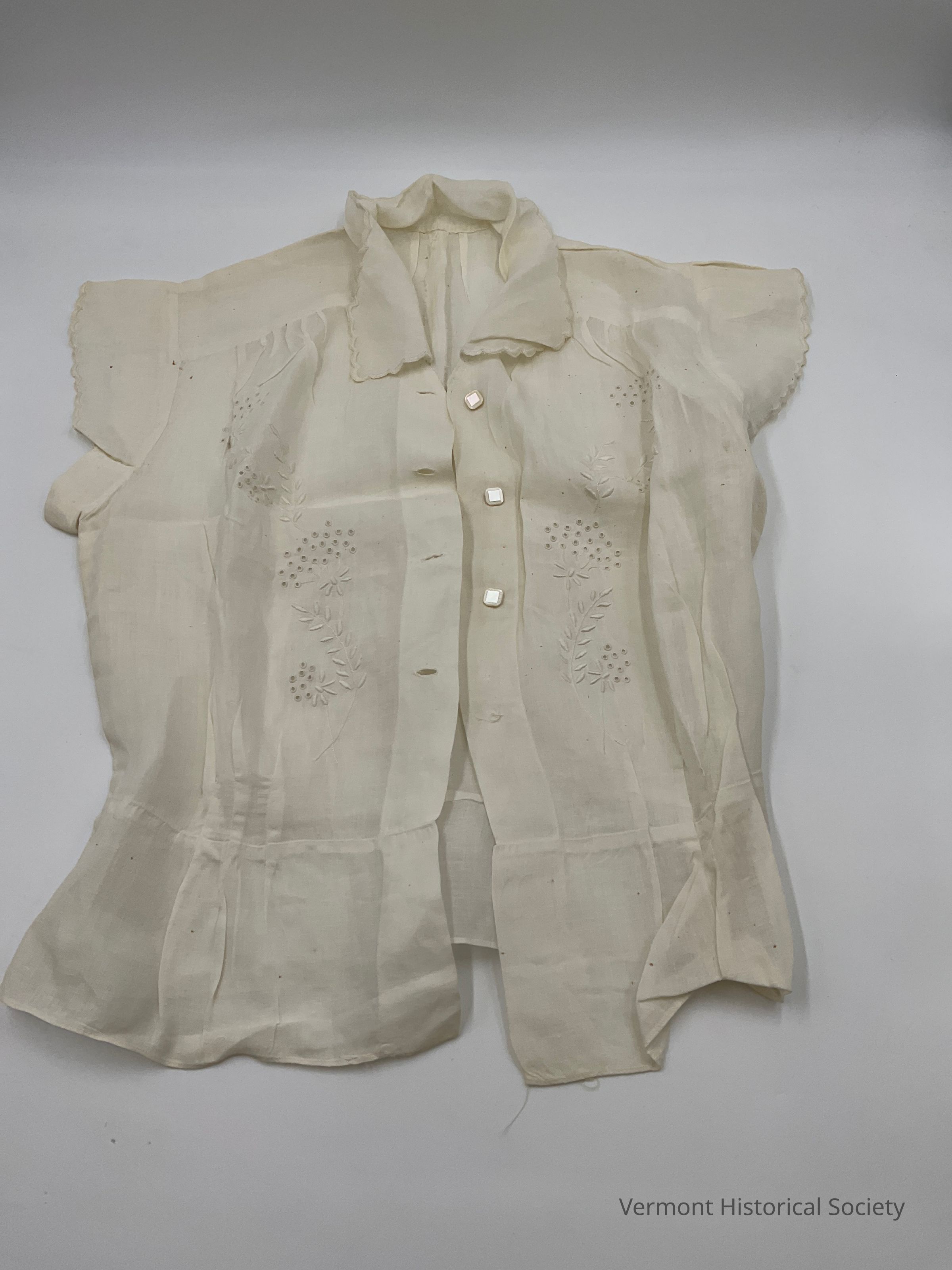 White cotton blouse with butterfly sleeves. It is embroidered on both sides of the front with whitework vines and eyelets. The falling collar and the sleeves have scalloped edges. It secures up the center front with square mother-of-pearl buttons. There are tucks shaping the waistline above a short peplum.