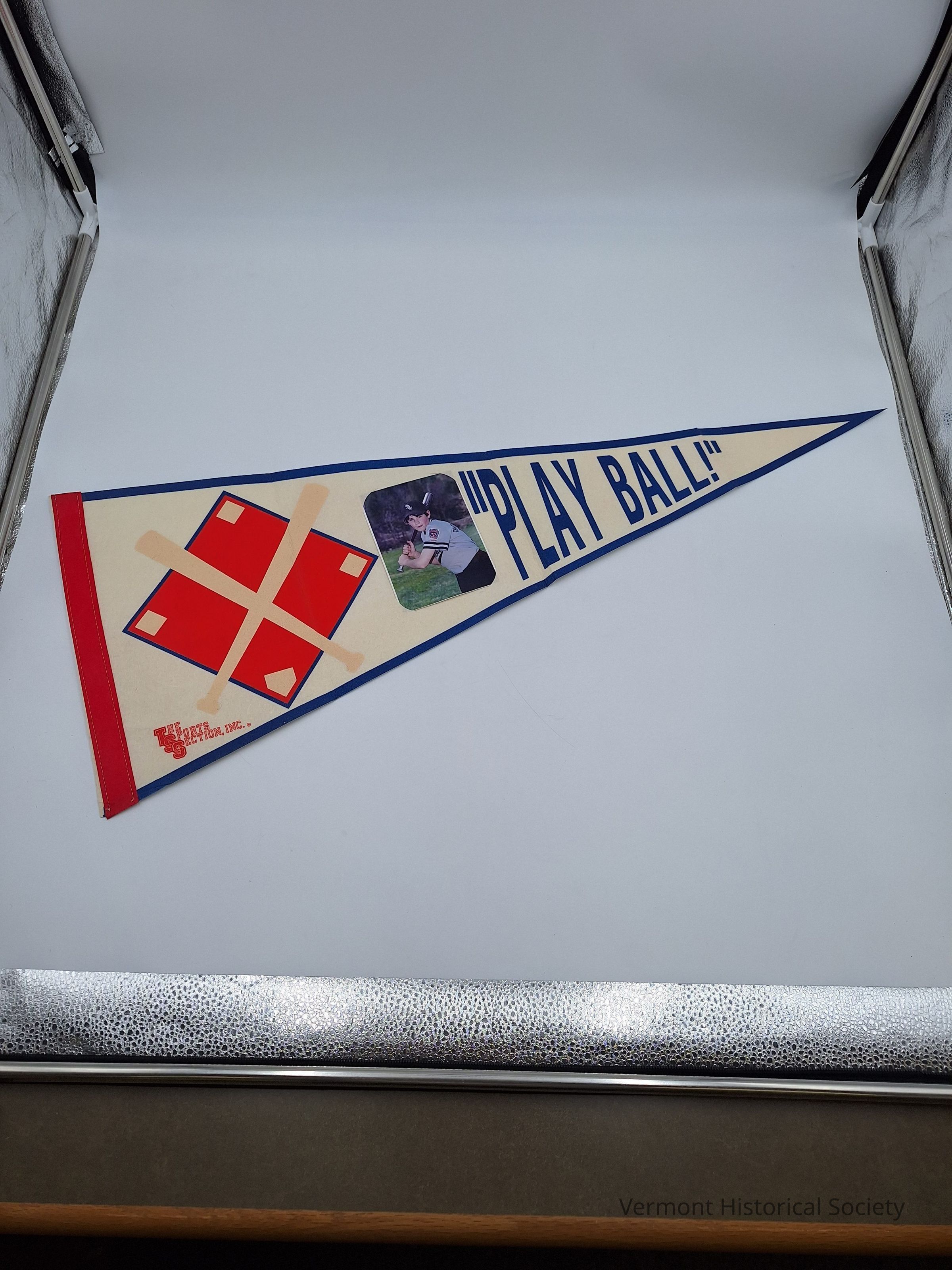 Stiffened felt banner. The banner has a white ground with red felt stitched vertical seam on the wide end and printed bright blue border on the long sides. The banner has a red baseball diamond outlined in blue with two baseball bats crossed over it, a photograph of Kenny Lindner in his Waterbury White Sox uniform in batting stance, and "PLAY BALL!" printed in blue from left to right.Acquisition