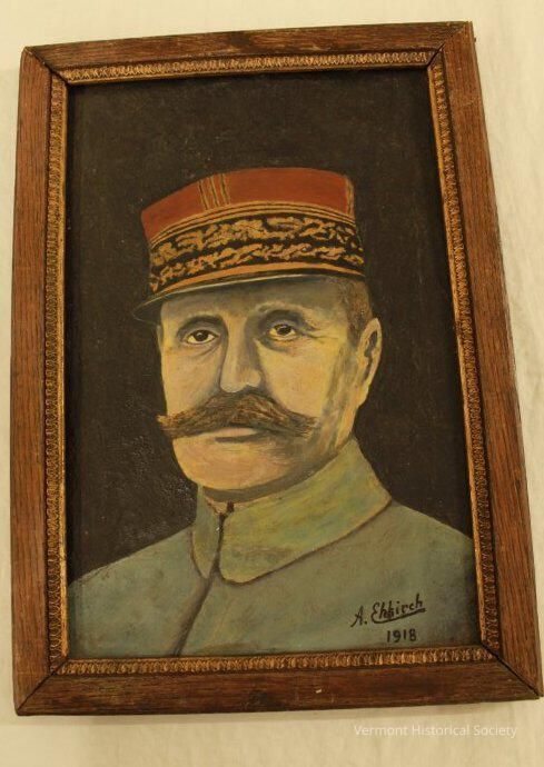 Painting of a mustached man in an official looking hat and blue jacket. In a wooden frame. Signed by A Ehkirch 1918. A sticker on the back says it is a portrait of "Foch." Ferdinand Foch was the commander of Allied Forces at the end of World War I.Context