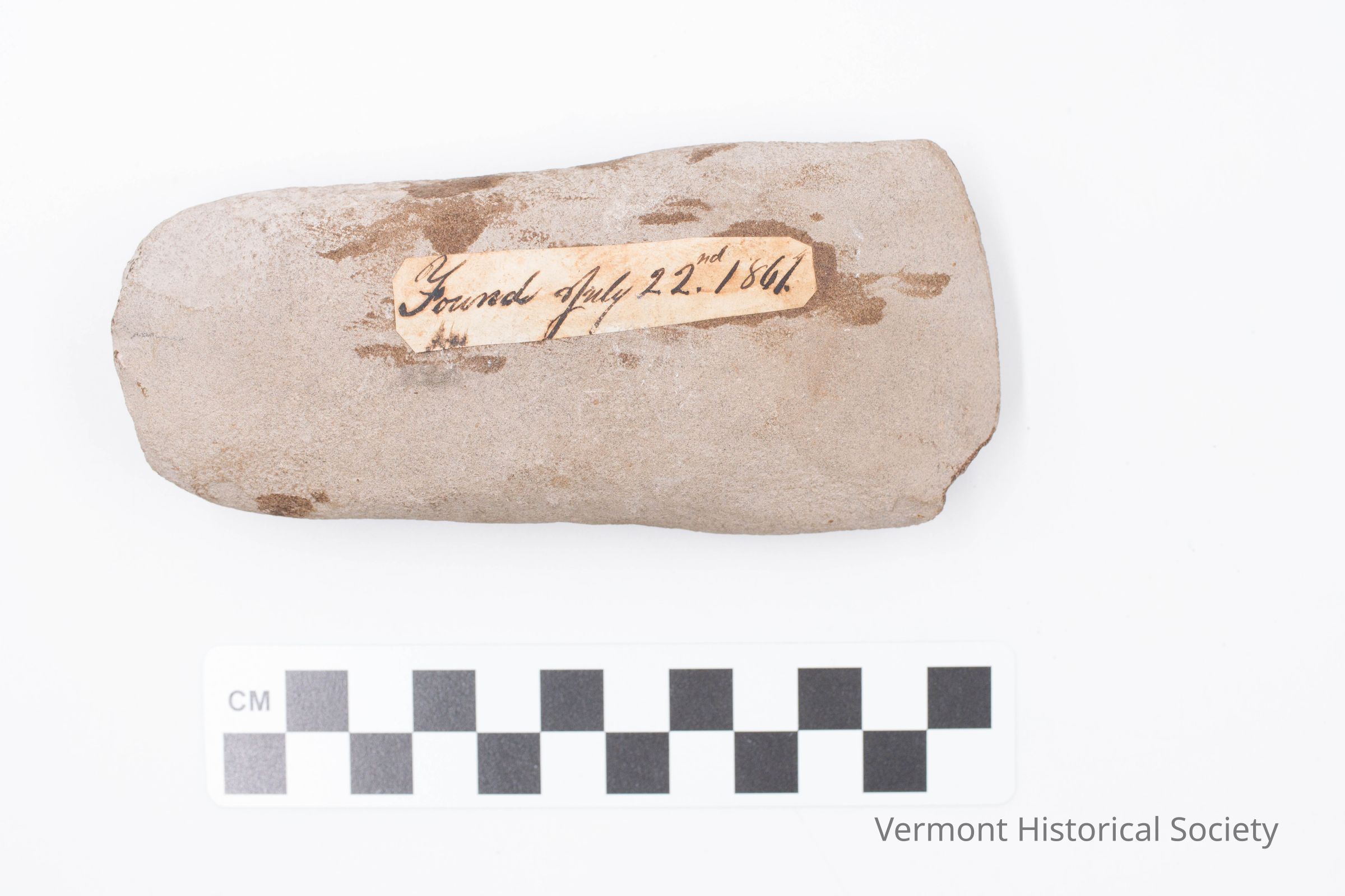 Ground stone celt. There is a rectangular paper label glued to one side with the inked inscription, "Found July 22nd. 1861."