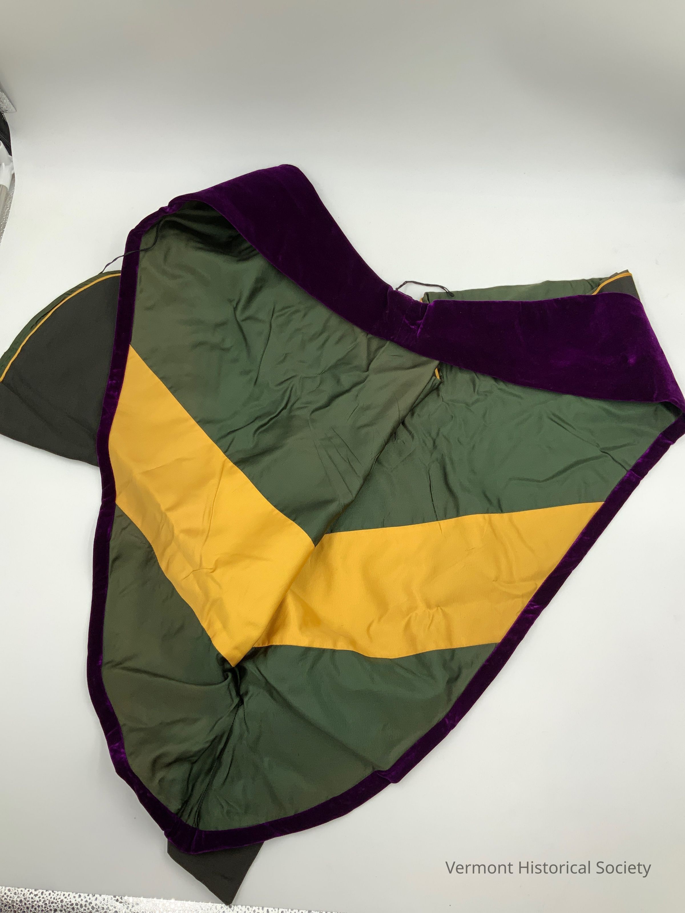 Academic hood. The outer fabric is black, and the lining is green with a yellow stripe. The opening edge is bound with purple velvet.