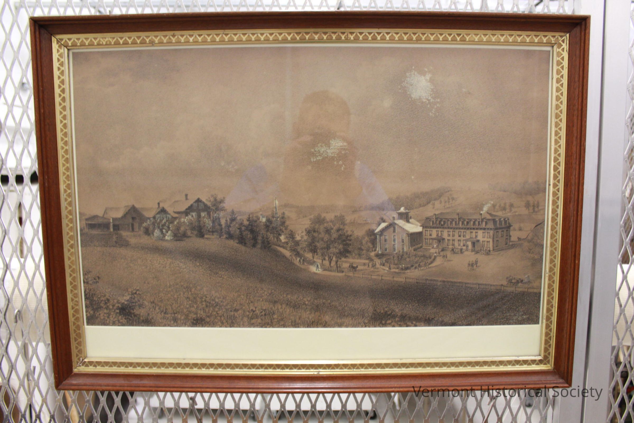 "Barre Academy," by James Franklin Gilman, 1873. Charcoal and white gauche on brown paper. Depicts building with mansard roof and a smaller. Greek Revival building. Right center-many people clustered around it. The left center shows a large gabled house or top of a hill. There is a road which runs betwee the rwo buildings, several horses and carriages on the road.Type of Drawing