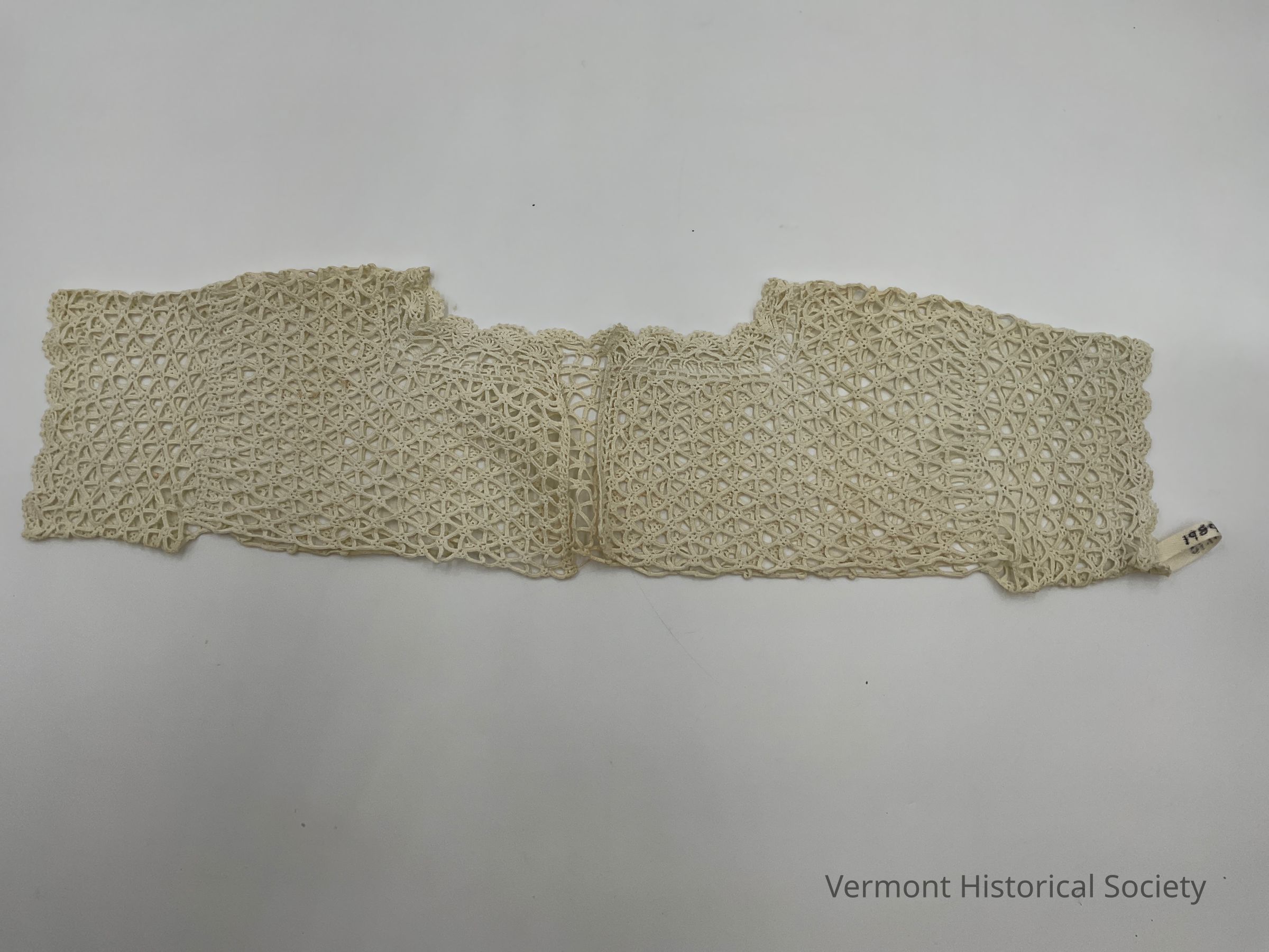 Crocheted yoke, likely for a camisole. It has short sleeves, and opens at the center front. It is about 5 inches from the neckline to the bottom edge.