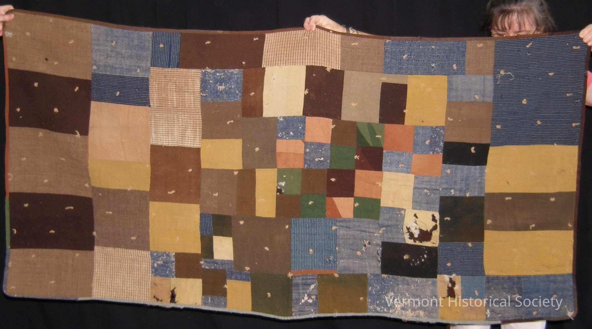 Pieced quilts made from irregularly sized and placed rectangles of woolen fabric in blues, browns, yellows, and greens. . A few squares in the center are pieced from smaller shapes. The reverse is backed in brown pieced wool. The edges are bound with wool in brown, and blues. The quilt is stuffed with wool batter, and rather than being quilted, it is tied.Context