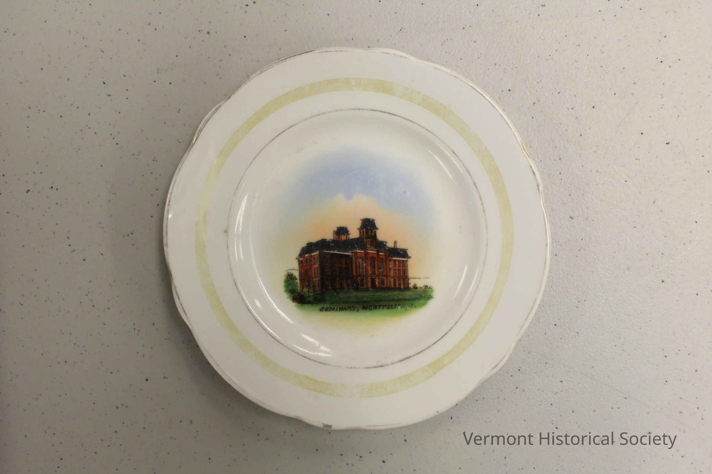 White ceramic saucer with a full-color illustration of a large institutional building in the center. The image is labeled, SEMINARY, MONTPELIER, VT." There are lines of gilding around the shoulder and rim of the dish, and a yellow ring around the border. The bottom of the saucer is marked, "WHEELOCK MADE IN GERMANY FOR MARVIN & SHERBURNE MONTPELIER, VT DRESDEN."Context