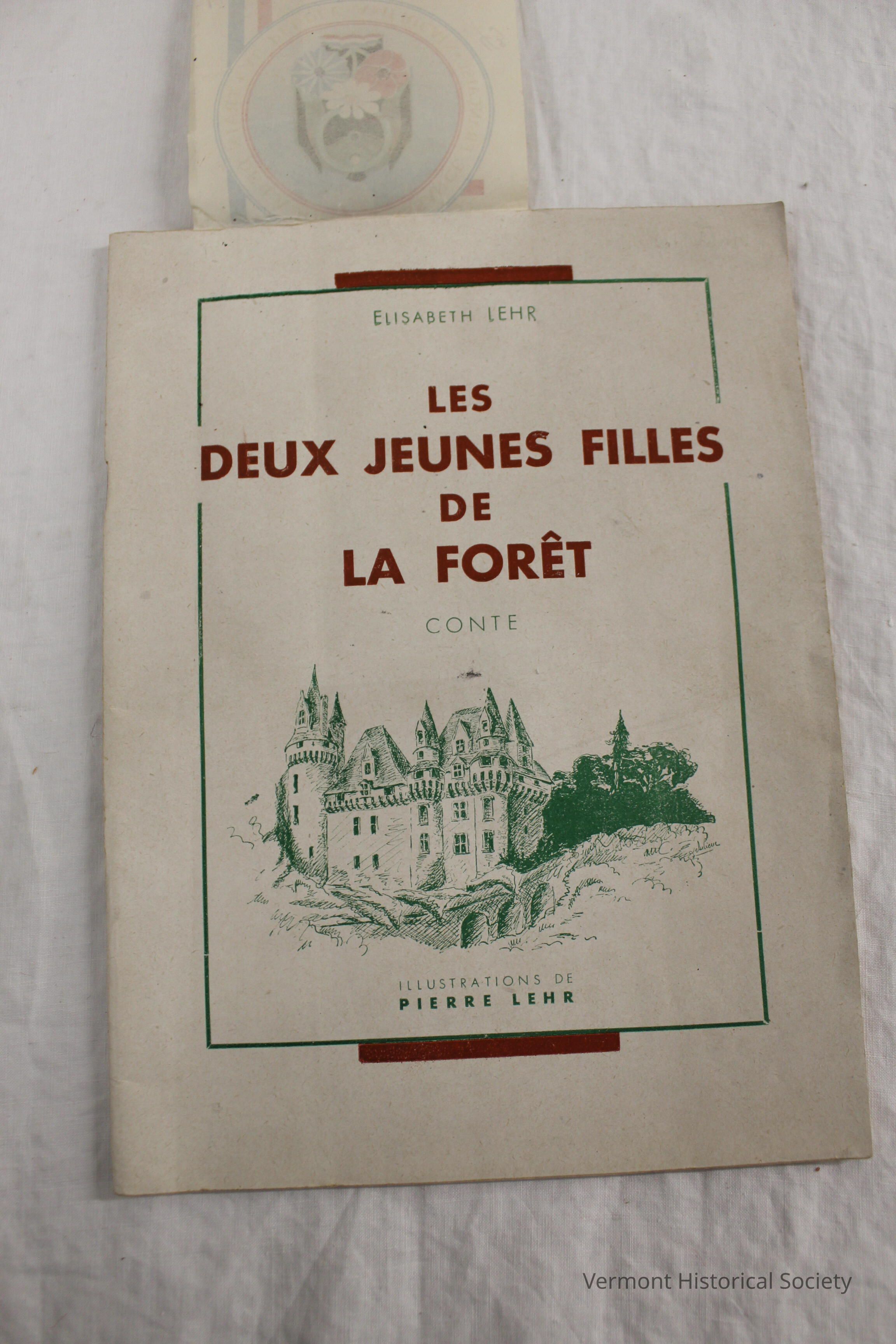 Paper-covered book titled, "Les Deux Jeunes Filles de lar Foret." Poem inside the cover. Author Elizabeth Lehr.