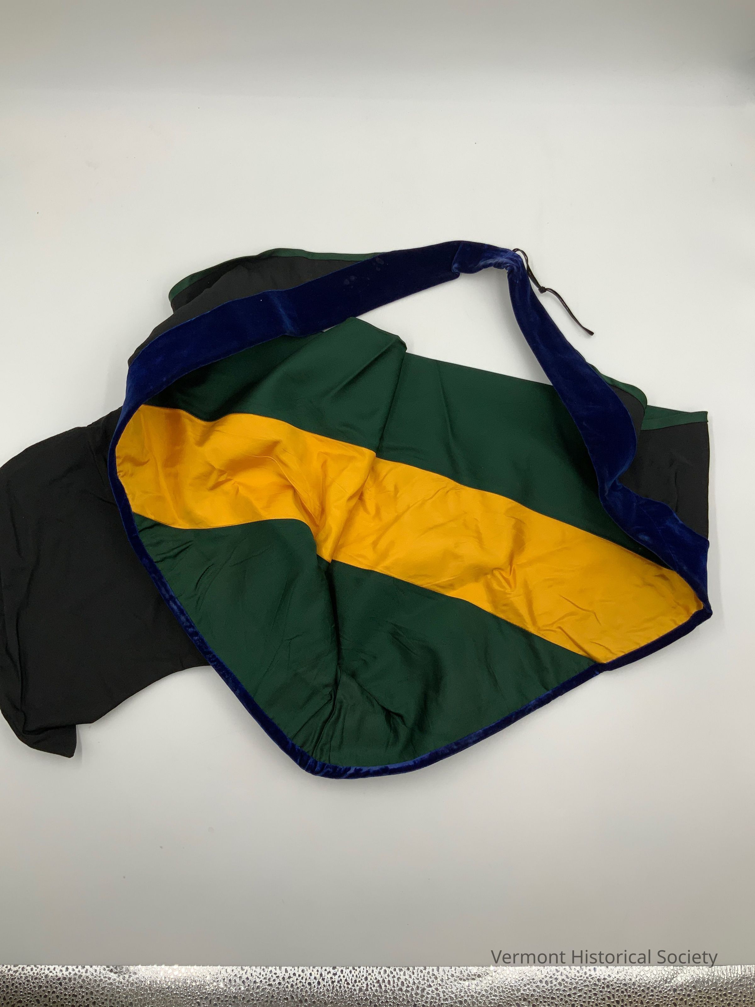 Academic hood. The outer fabric is black, and the lining is green with a yellow stripe. The opening edge is bound with blue velvet.