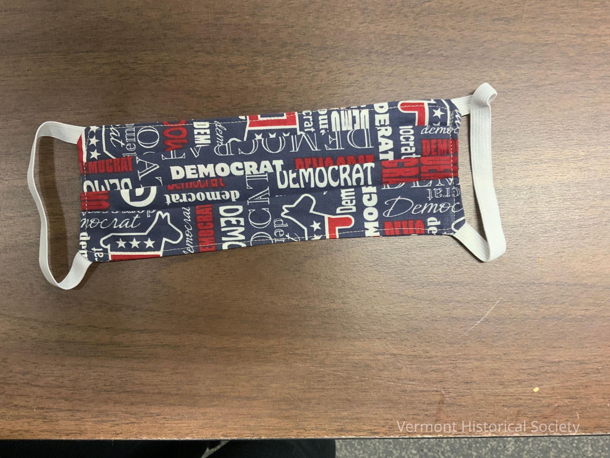 Pleated cotton surgical-style face mask with an all-over printed design of the word "Democrat" in different fonts. There are elastic ear loops on either end of the mask.