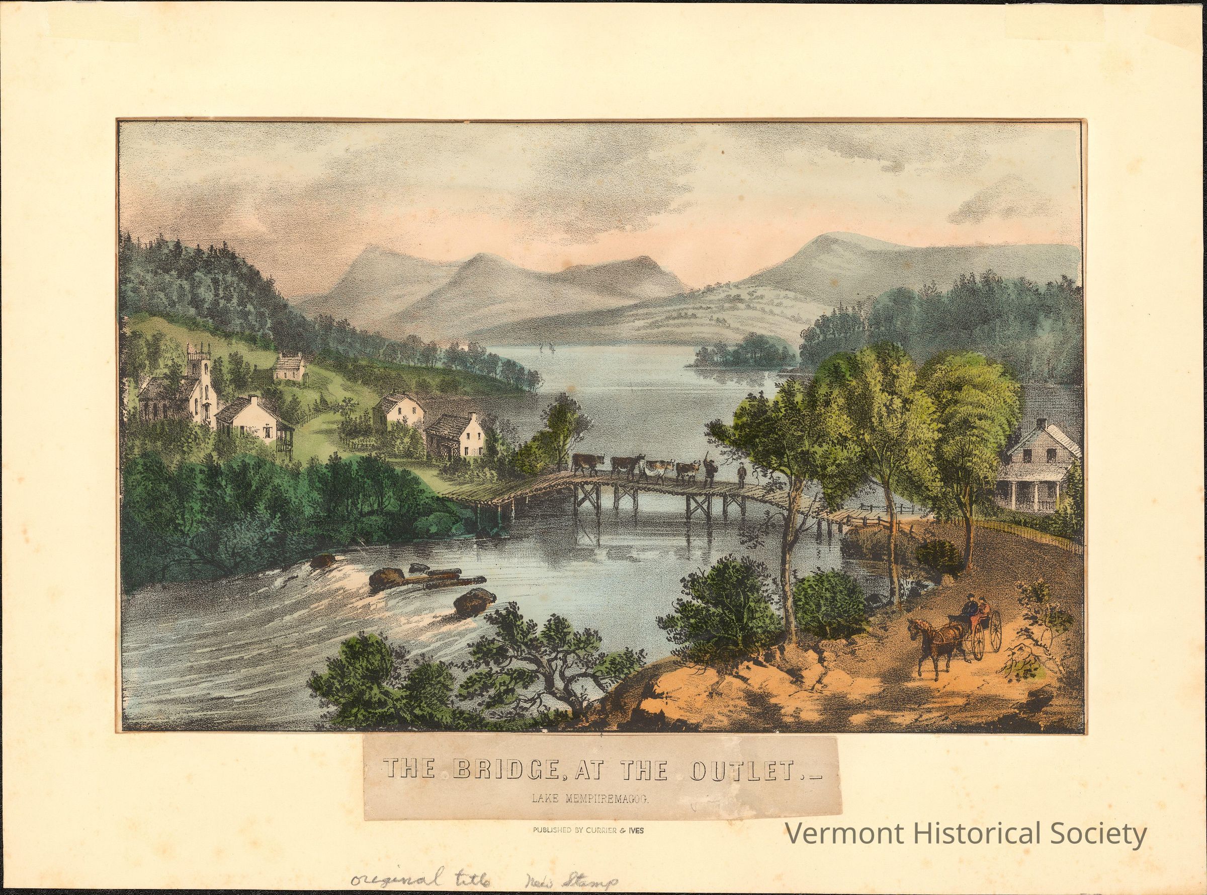 Colored lithograph showing a bridge over a wide river. The river runs up the center of the composition, curving at the bottom to the lower left corner. The land on the right is dirt with a white house near the bridge and couple on a horse-drawn cart. The land on the left is grass with several white buildings, including a church. There are men driving cows across the bridge and mountains in the background. The print is cut out and pasted to a mat board. The title, "THE BRIDGE, AT THE OUTLET." is printed on a separate piece of paper and pasted to the mat board below the print.Artwork Details