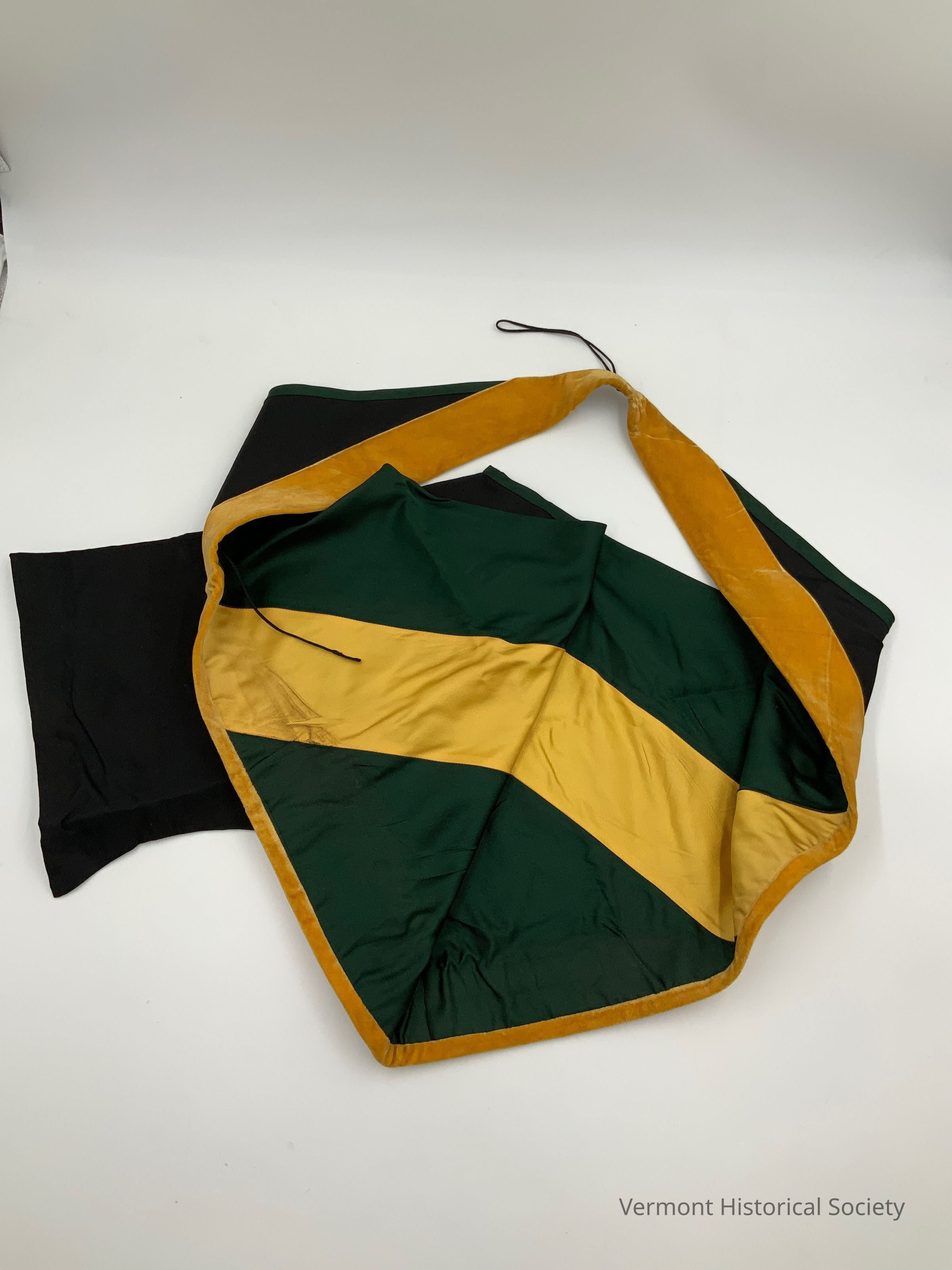 Academic hood. The outer fabric is black, and the lining is green with a yellow stripe. The opening edge is bound with yellow velvet.