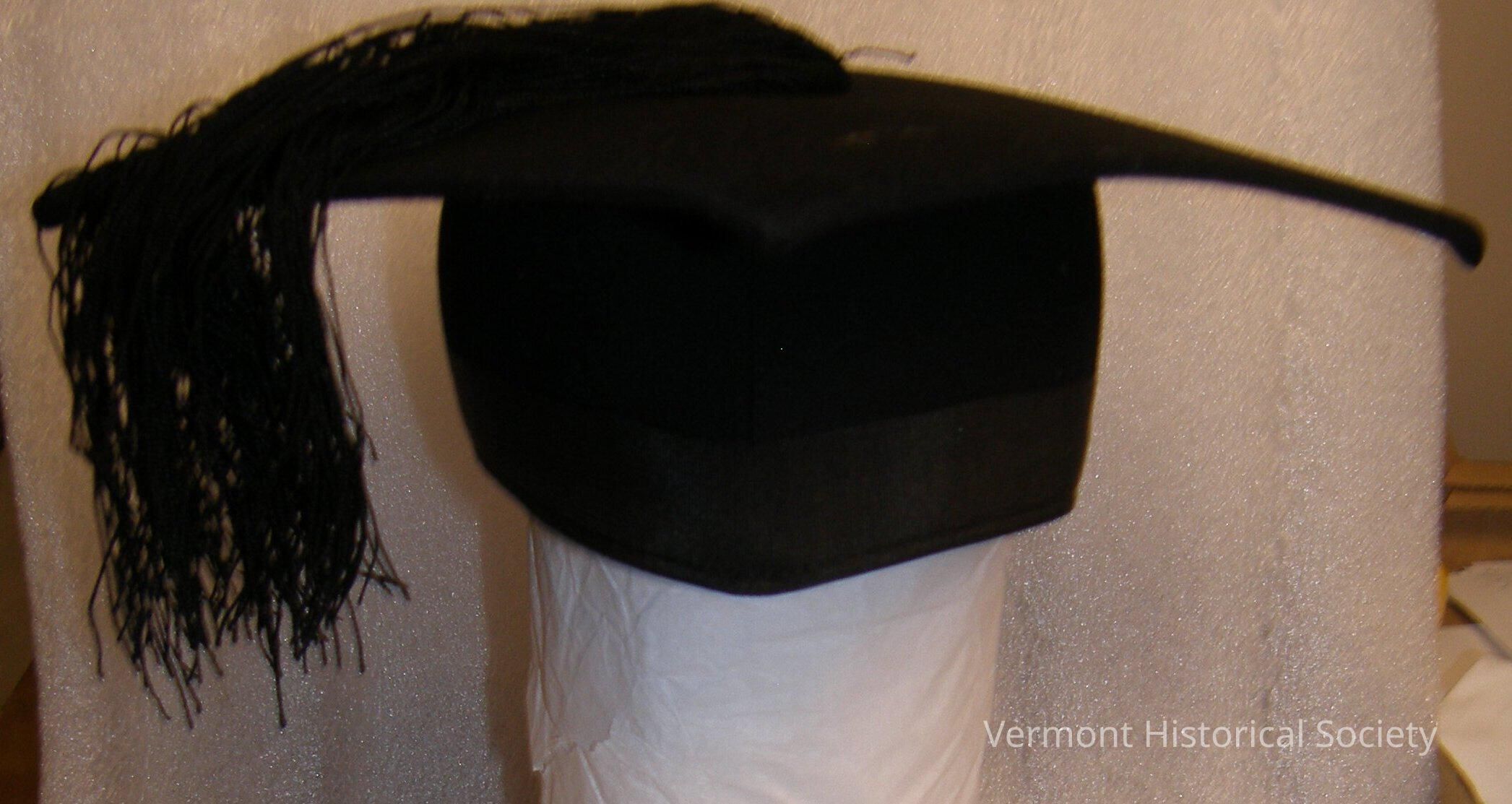 Black mortarboard, or graduation cap, with a black tassel. The crown has a square, black top that extends outward from the fitted crown. The interior lining has a cotton label that reads, "Warren R. Austin".