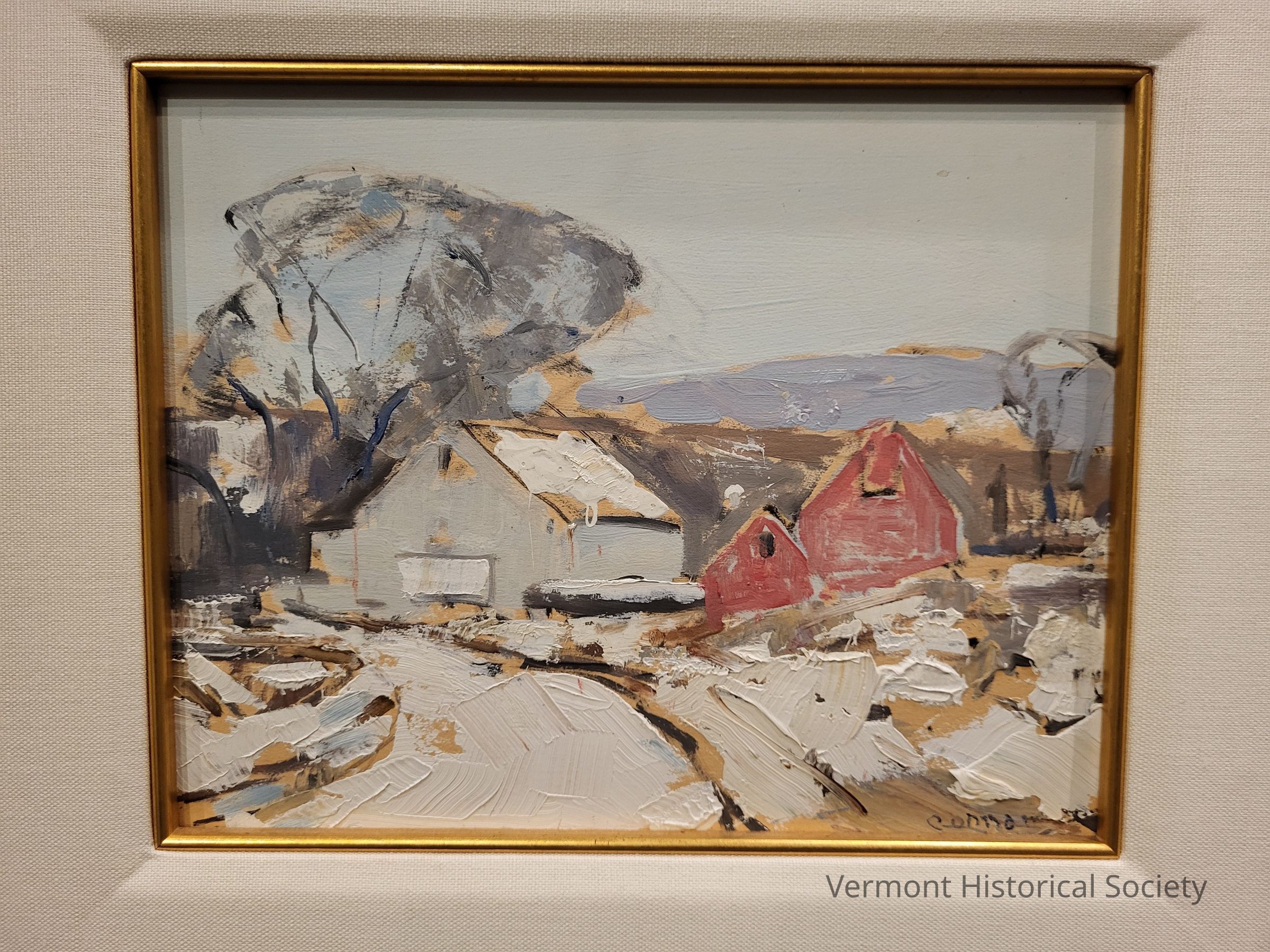 Small oil painting of a winter farm scene. A road in the foreground leads to a grey barn with other red outbuildings. A large tree appears behind the barn and mountains can be seen in the background. The painting is mostly in shades of greys and browns except for the two red buildings. A label affixed to the back entitles the painting, "Road to Sunderland."Artwork Details