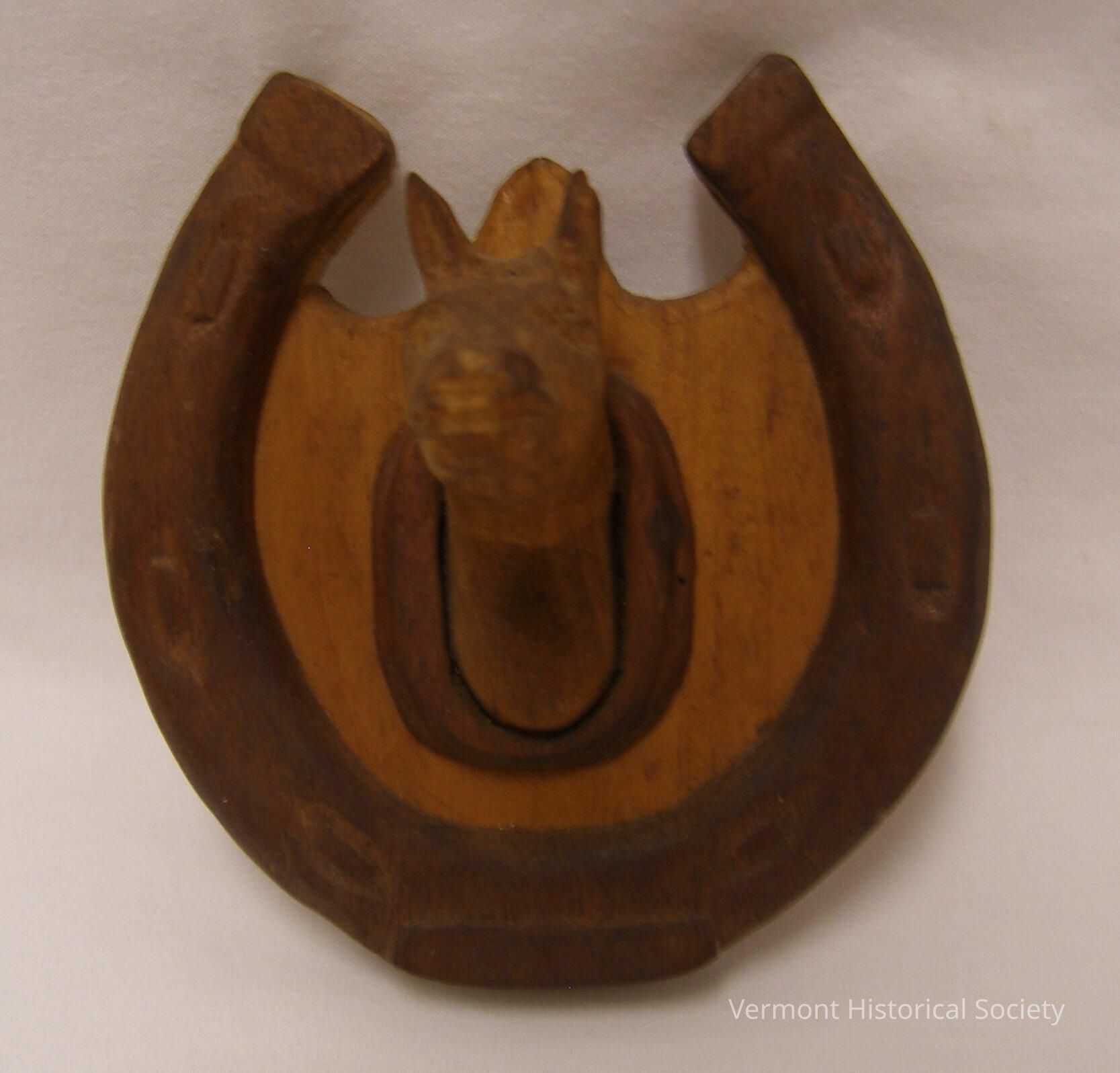 Small, whittled hanging plaque in the shape of a horseshoe with a horse's head in the center. The horse's head is three-dimensional and mounted similar to a hunting trophy in the center of the plaque. The back is marked, "Made in Feb - 13 - 1953 carved from scrap with jackknife." There is a brass hanging ring attached to the back with a screw.Context