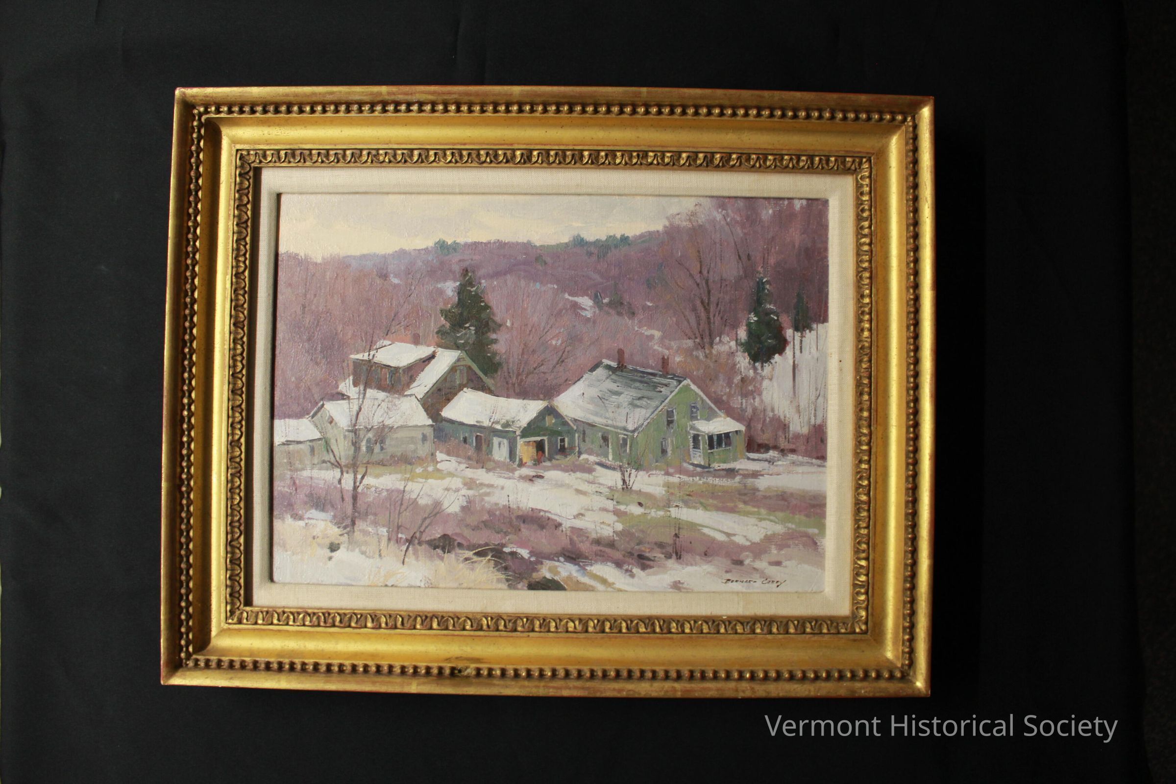 Oil on canvas painting of a Vermont hill village on a gray winter day. Central to the painting is a cluster of three dwellings surrounded by hills, trees, brush and snow. Signed by artist Bernard Corey in lower left corner. Gallery label on back of work from Atlantic Gallery gives the title as "Vermont Winter."Artwork Details