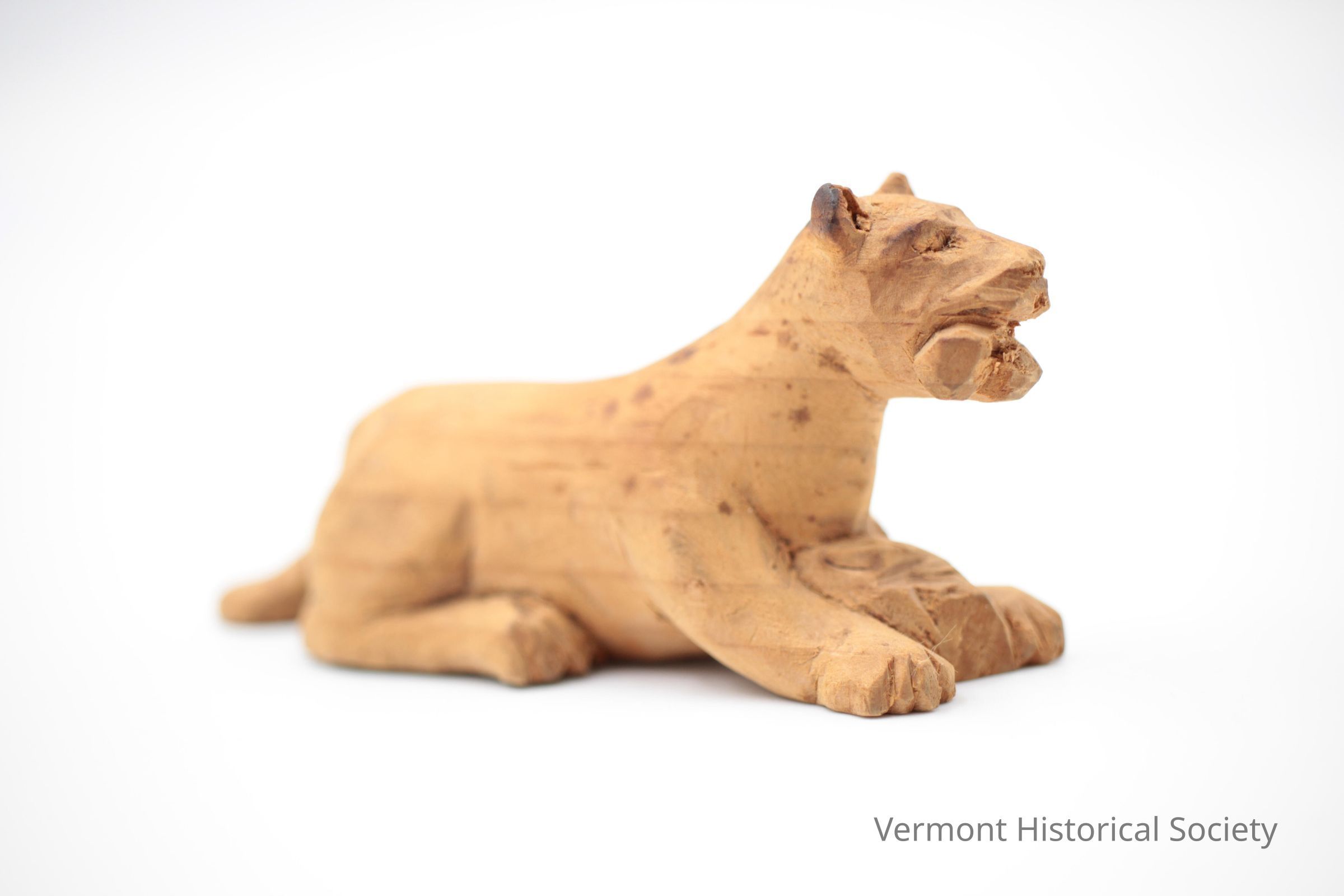 Small wooden carving of a catamount, or mountain lion. It is shown lying down with a rock between its front legs and something in its mouth.Artwork Details