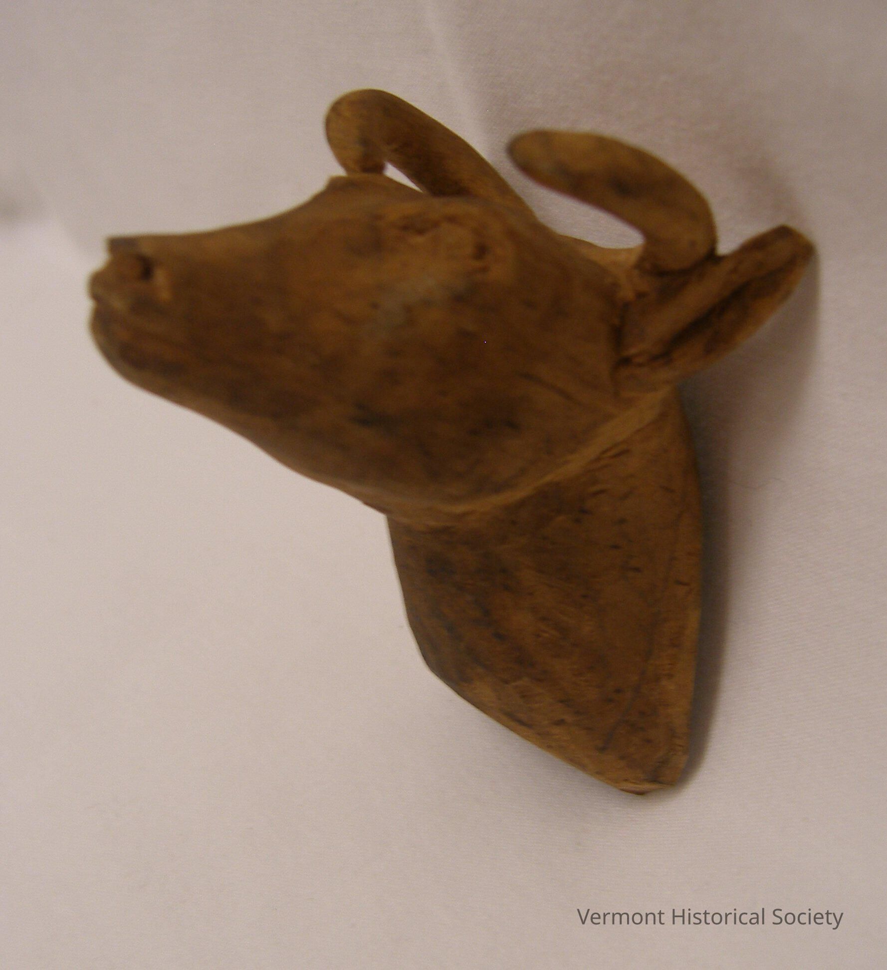 Small wooden carving of a bull's head. The carving is flat on the back for mounting to a wall, similar to a hunting trophy. The bull has two curved horns.Context