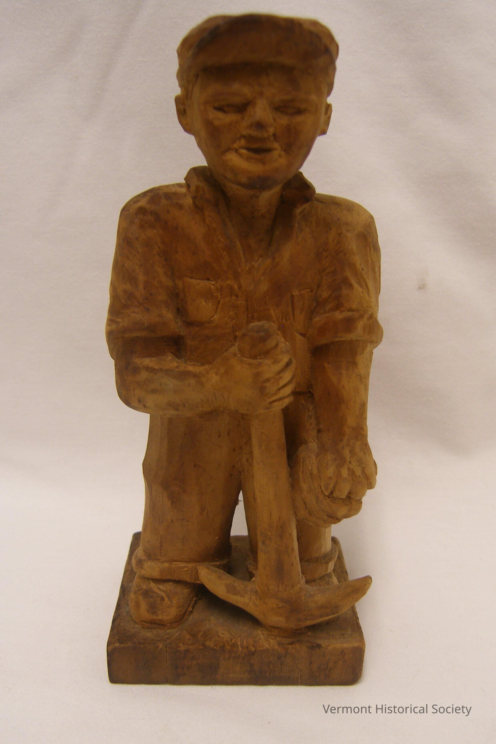 Small wooden carving of a man. The man is wearing cuffed pants, a button up shirt with the long sleeves rolled to his elbow, and a brimmed hat. He is holding a pickaxe. The carving is made as one with a square base.Context