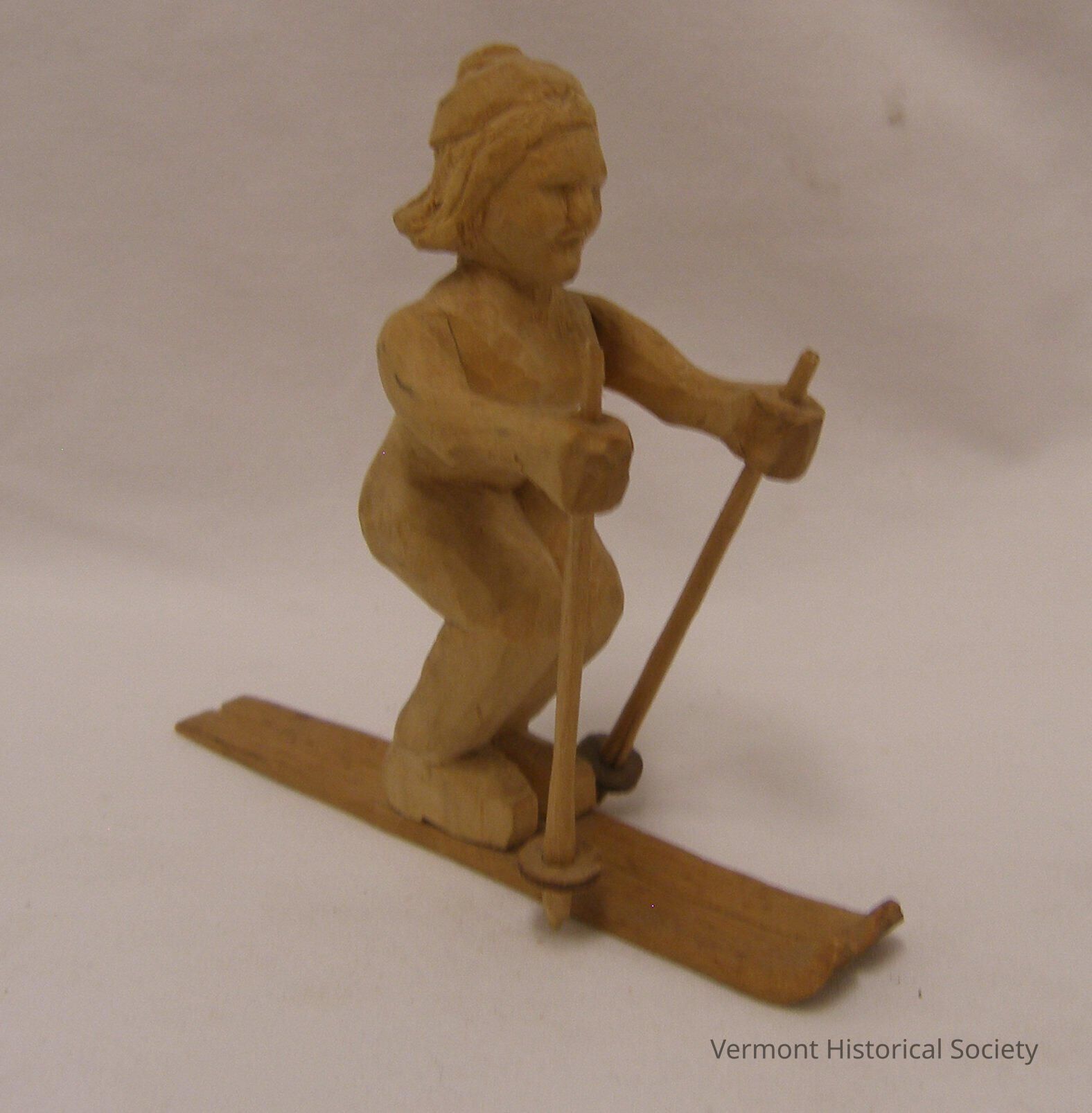 Small wooden carving of a woman on skis. She has shoulder-length hair and is wearing a beanie. She is standing on two skis with her knees bent and is holding ski poles.