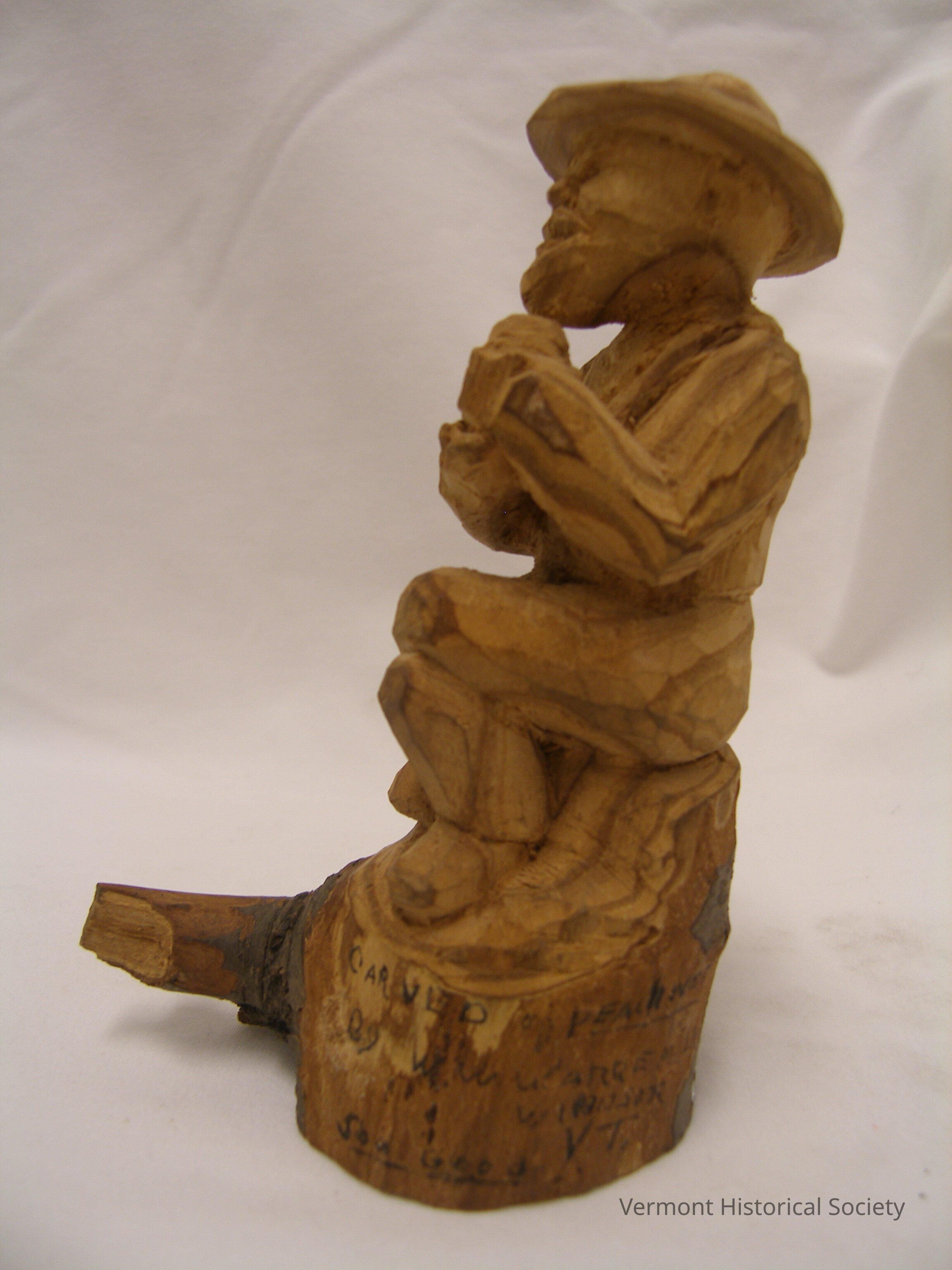 Small wooden carving of a man sitting on a stump. The man has his legs crossed at the knee and is holding a round object. He is wearing long pants, a long-sleeved shirt, and a brimmed hat. The stump is inked with the inscription, "CARVED of Peach WOOD by Wm. W. Warren Sr. Windsor, VT. Soo Good." The bottom of the stump is inked with the inscription, "Jack Nife CARVED by W. W. WARREN ST PEACH WOOD".Context