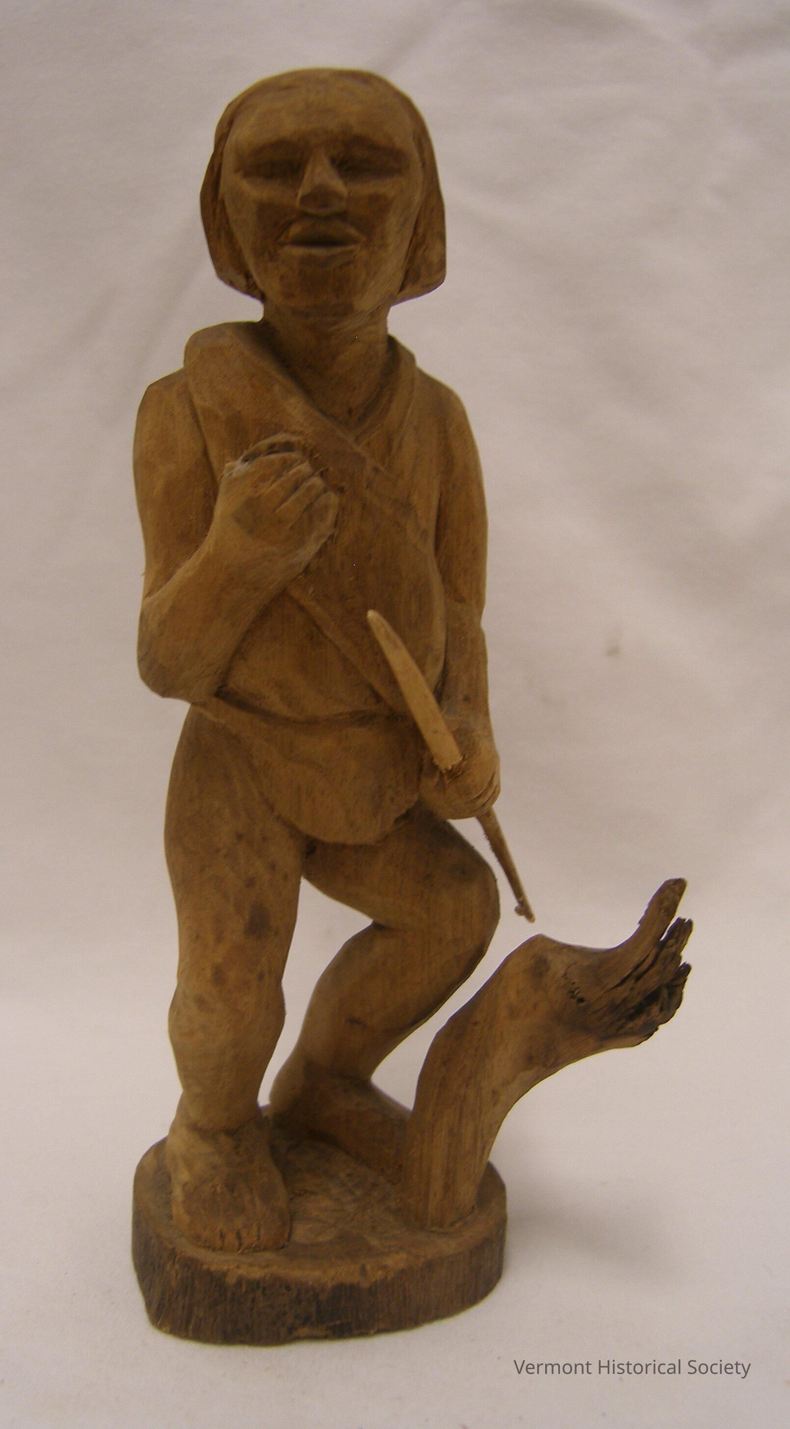 Small wooden carving of an indigenous American man. He is shown wearing only a small garment over his groin, with a sling across his chest. He is holding a bow and standing with bent knees beside an irregularly shaped object rising from the circular base.Artwork Details