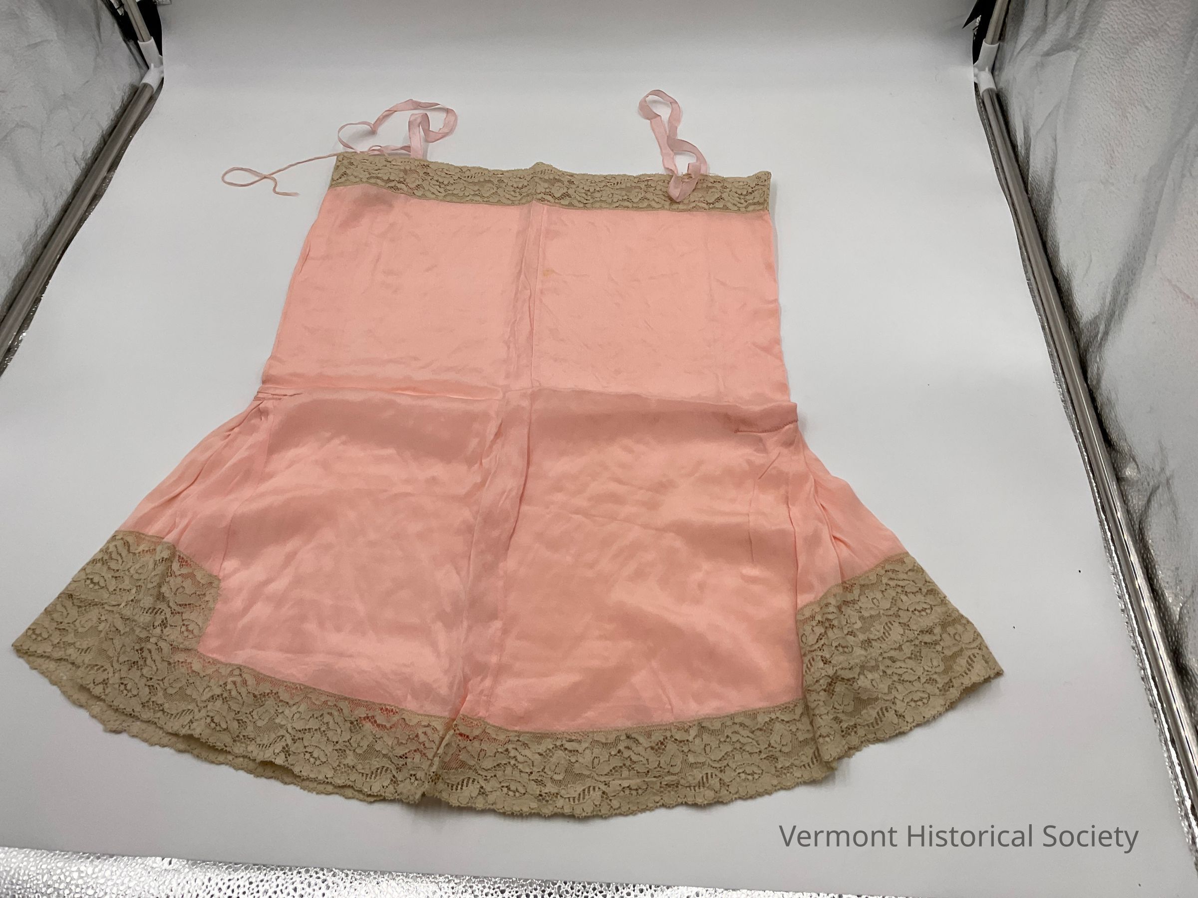 Pink chiffon slip with beige lace around the bodice and the bottom hem. The straps are pink ribbons. The skirt flares outward and reaches to just below the wearer's hips.Context