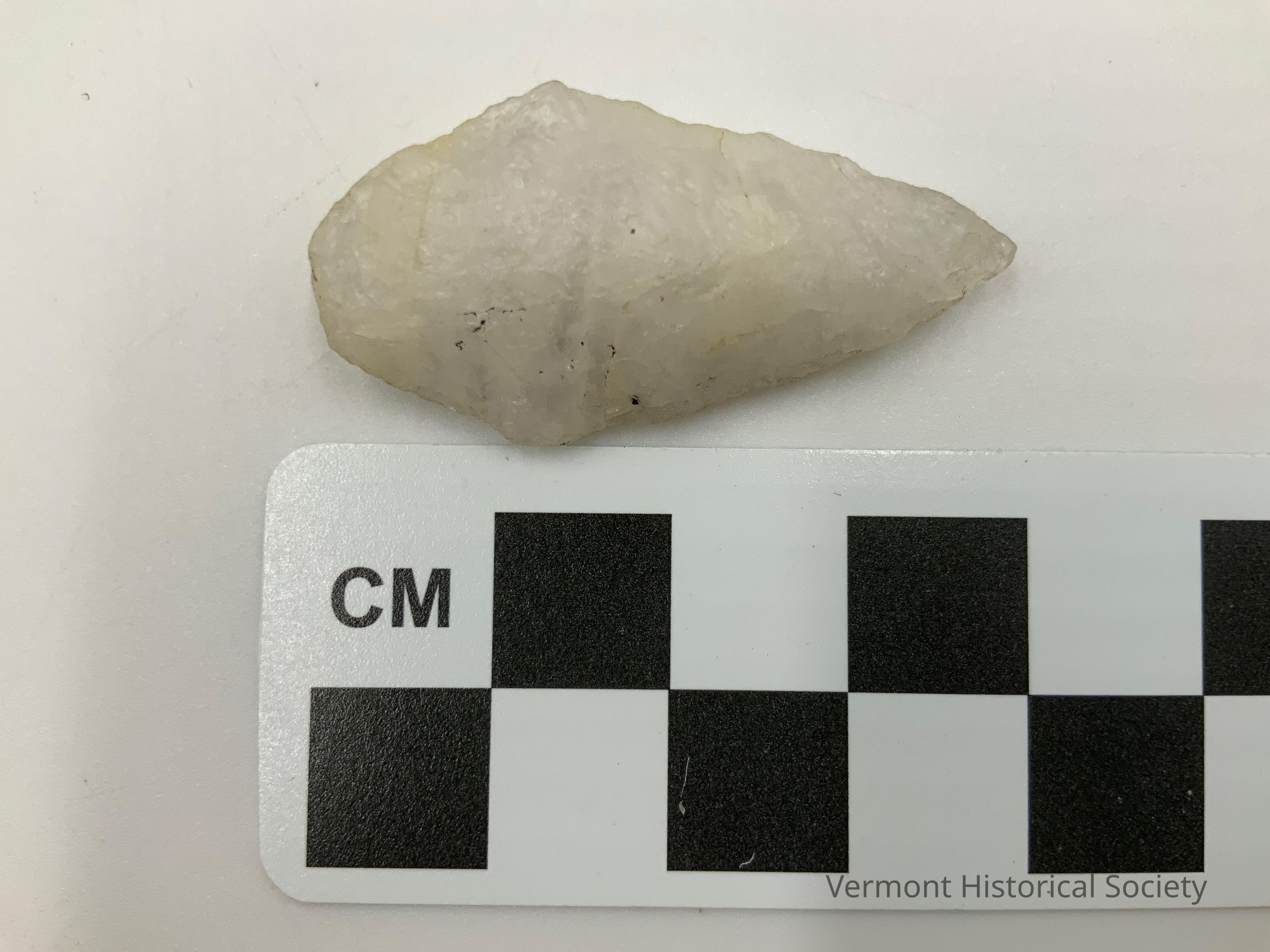 Small chipped quartz projectile point with a contracting stem. It is oval shaped with slight shoulders.