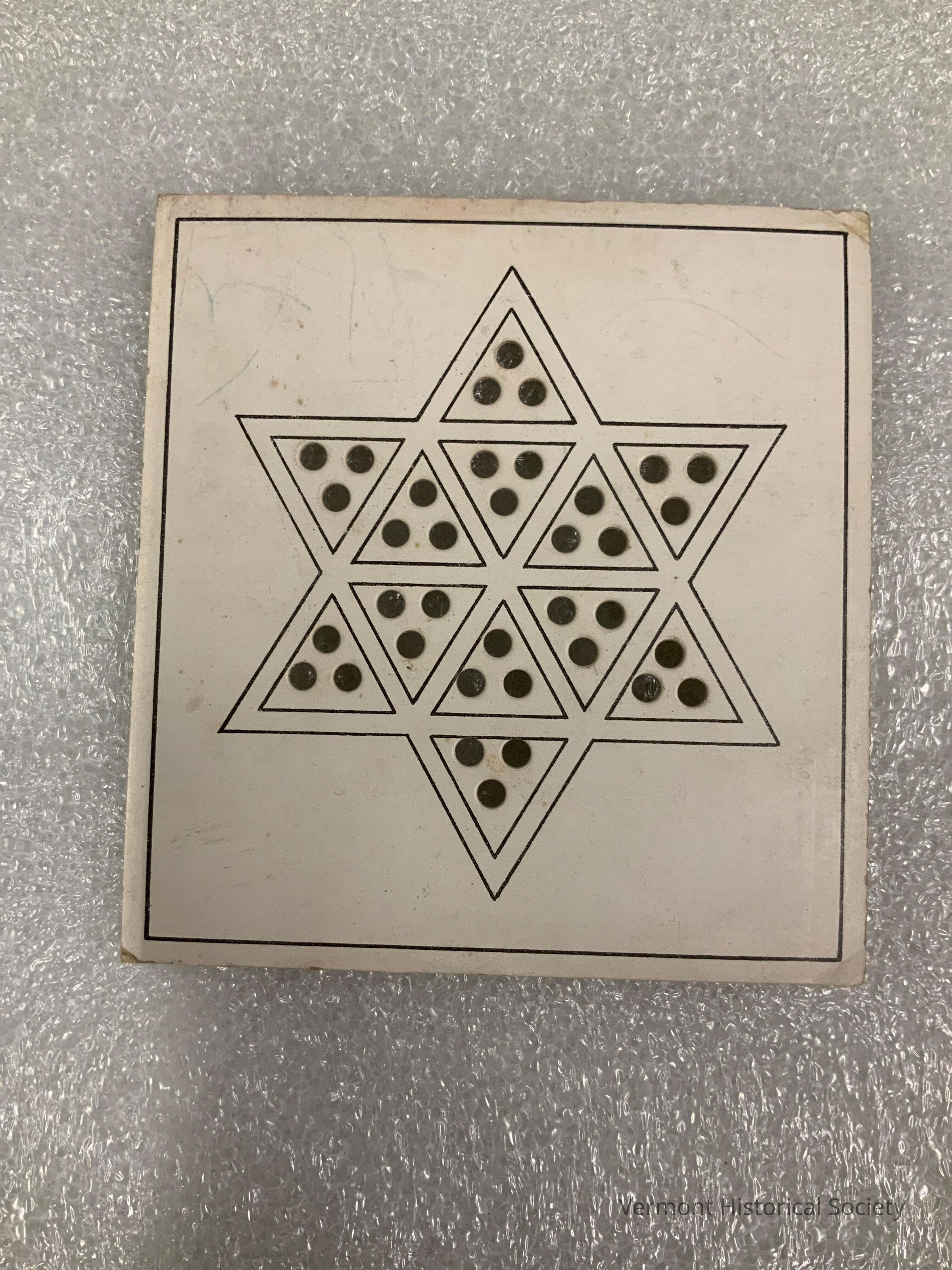 Square cardboard sewing card printed on one side with a six-point star segmented into twelve triangles. Each triangle is punched with three round holes.Context