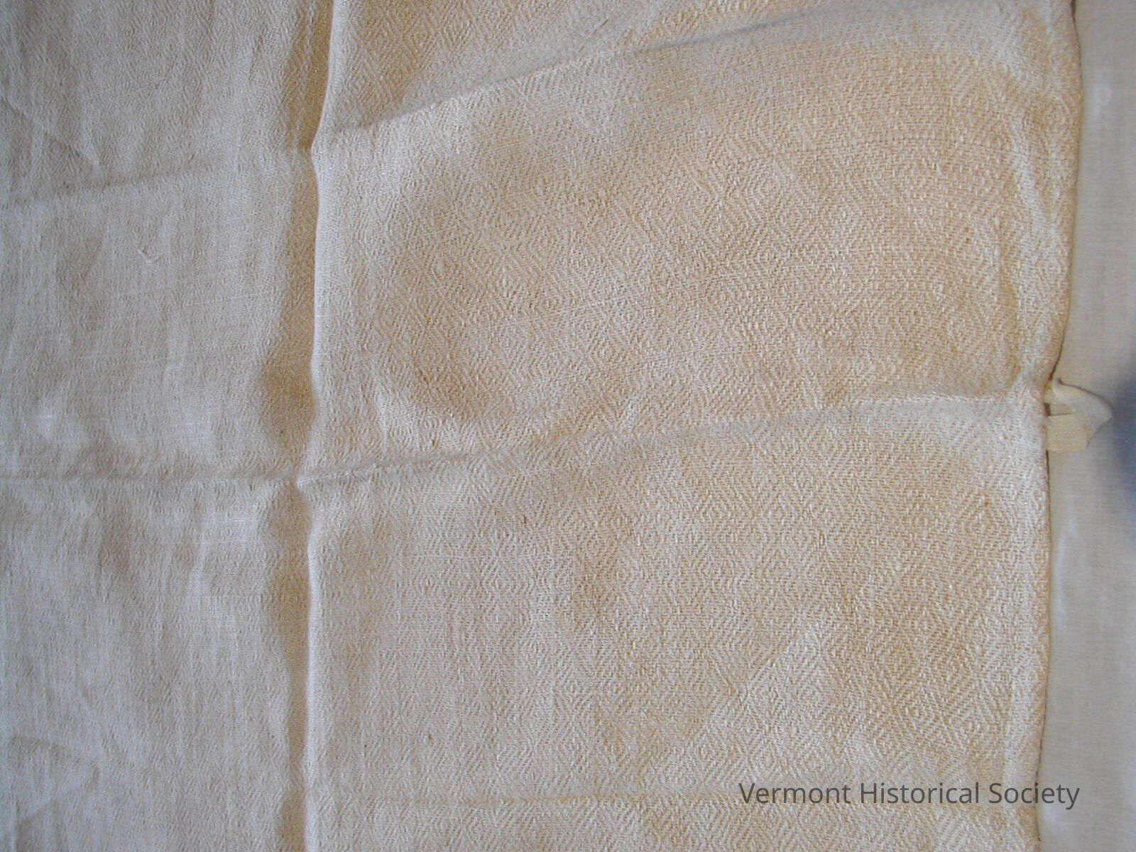 White linen towel in a birdseye twill weave. 2 sides are selvedges and the other 2 ends are hemmed. There is a tape loop on one end for hanging.