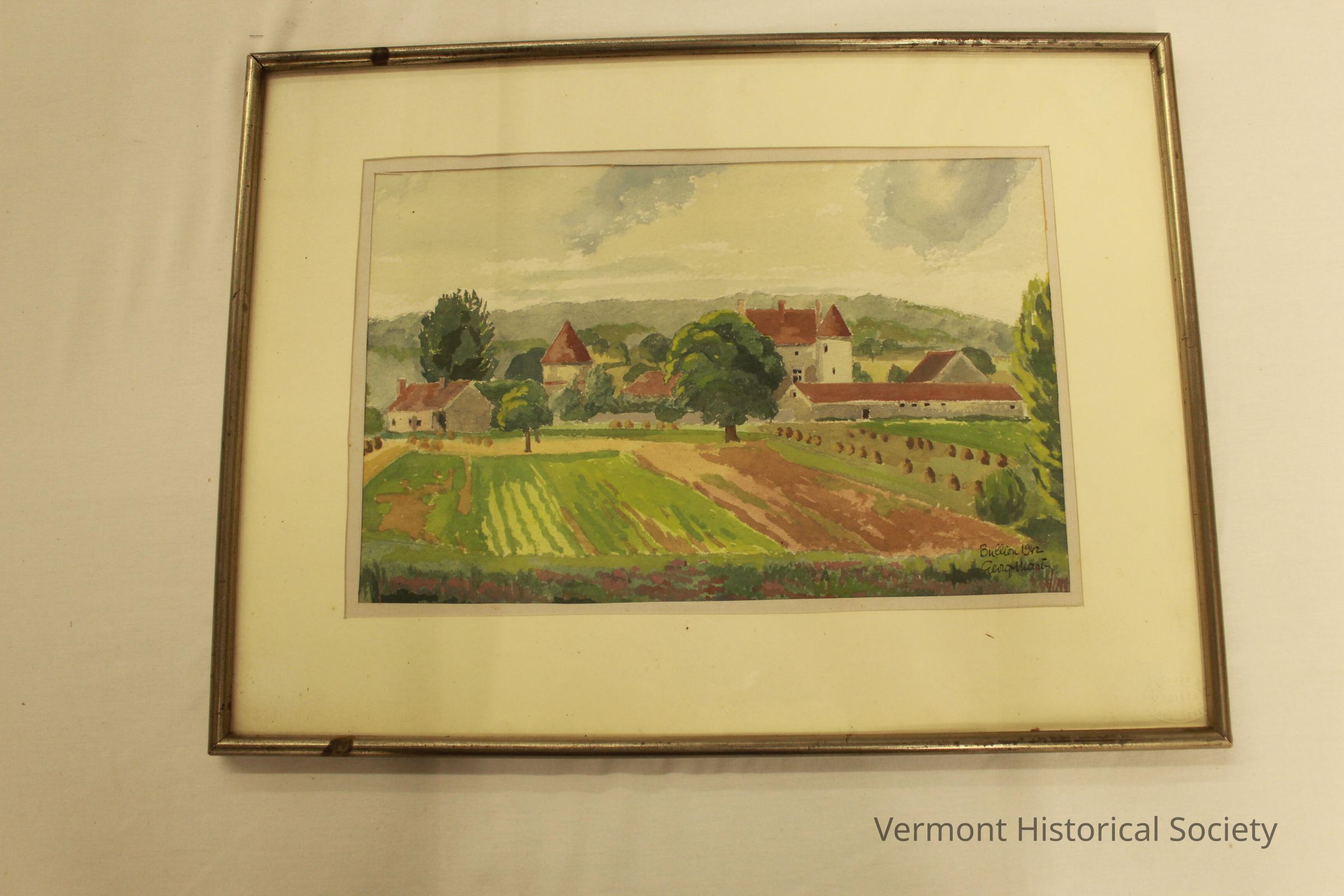 Painting of a farm scene in a wooden, silvertone frame. Words on picture say "Bullion 1942."Context