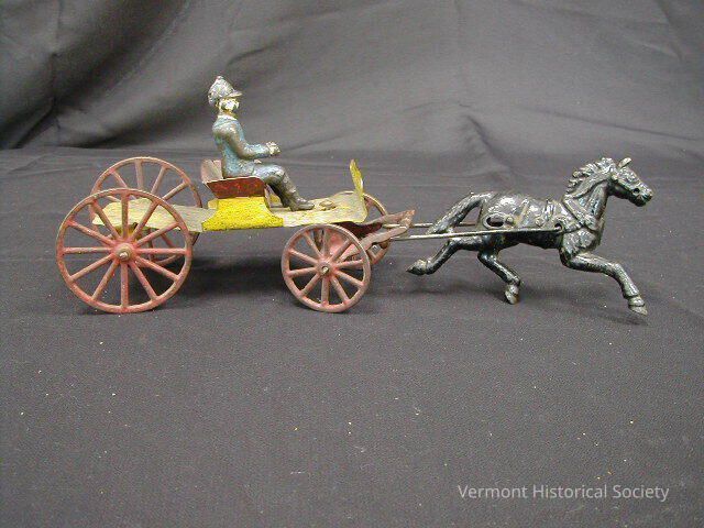 Cast-iron toy cart and horse, likely a fire truck. The cart is painted yellow with large red wheels. There is a raised bench at the center with an attached driver. The driver's clothes are painted blue, and he is wearing a helmet. The care is connected with a wire to a running black horse at the front.Context