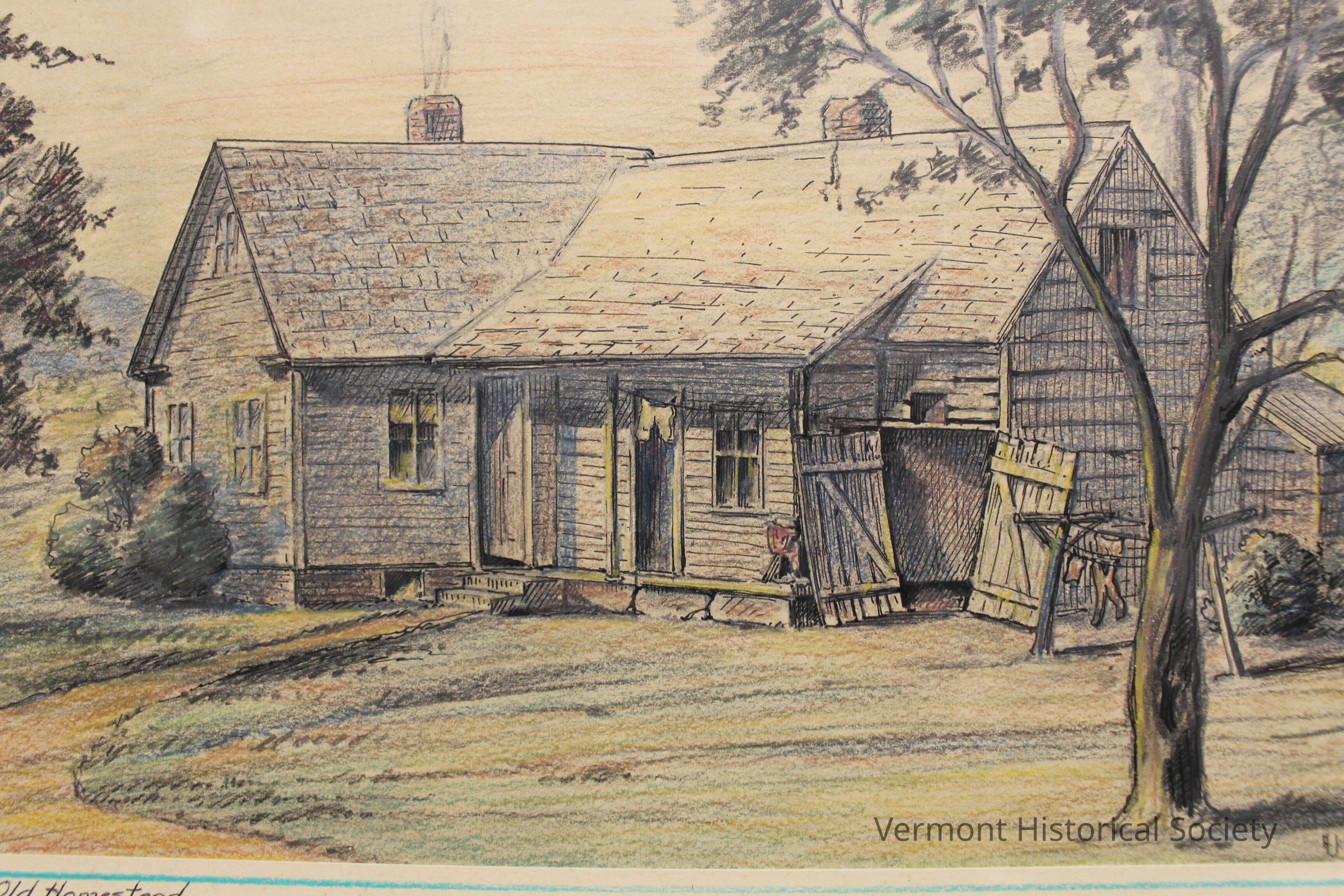 Framed color picture of an old farm house. The farmhouse is built in a T-shape, with the lower half of the house facing the viewer. The lower half has two doors, and a porch with a pair of shorts hanging on the cloths. To the right of the porch are two open wooden doors leading into what appears to be a shed. Next to the open doors is another clothesline with long underwear hanging. The top half of the building is paneled with wood, and has a tiled roof with a brick chimney, smoke is coming out of the chimney. There is a dirt path leading to the door of the house. On both sides of the path there is a green lawn. The right side lawn has a large tree in the foreground of the drawing. The left side lawn has a bush that is right against the house. Some branches of a tree are sticking out of the left side of the frame. On the left side of the frame is the title, "The Old Homestead." On the right bottom corner, written on the picture is the artists signature, and the date, "1929." The back of the frame is covered in cardboard, which is taped to the frame. Written on the cardboard is, "House in East Barre VT/By Al Comi/Barre VT." There is also a white card tapped to the cardboard which reads, "Al Comi/The Old Homestead/1929/colored pencil on cameo paper/Gift of the Estate of Ines Ruvera Comi/2000."Type of Drawing