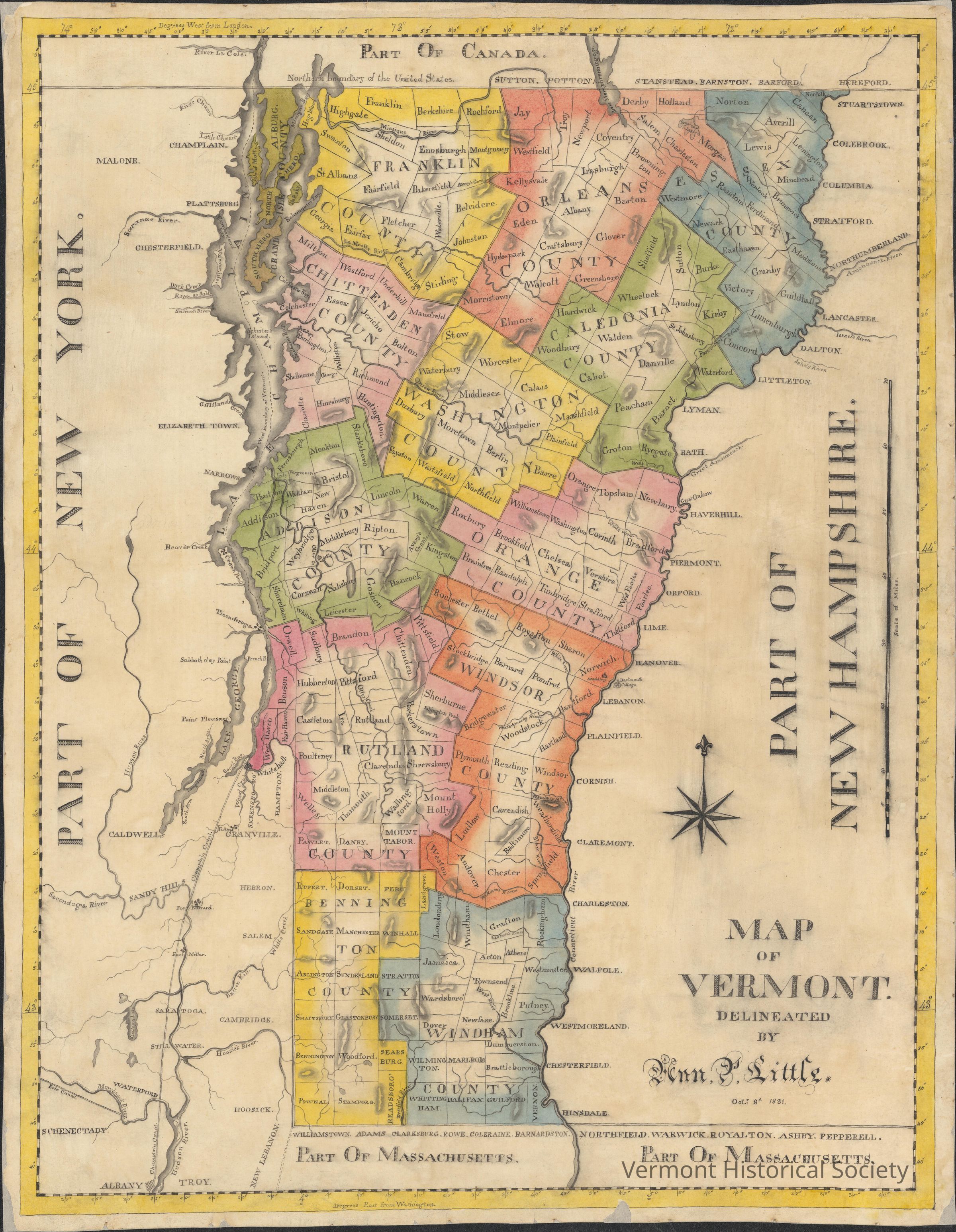 Outside of Vermont itself, several aspects of neighboring states are also depicted. The states of New Hampshire, New York and Massachusetts alongside Canada are all labeled as part of state/county. Massachusetts, New Hampshire and Canadian towns neighboring their Vermont border are all labeled on the border line and several nearby physical features are also depicted with the largest being the Connecticut river. New York receives far more detail than either Massachusetts or New Hampshire with several major landmarks(rivers and lakes) being depicted as well as town labels being placed in the spots approximating their actual geographic locations. Several military forts in southern half of New York are also Depicted including Fort Ticonderoga. Additionally, the City of Albany is also given a visual marker, using crossed lines to represent its streets. This symbol also appears in an unnamed place near West Haven Vermont. The map appears to use a privative version of the Lat/Long coordinate system Latitude being on distance from the equator and Longitude using both degrees west from Washington for long lines depicted on the top the map and long lines using distance east from London depicted at the top of the map. Next to the "Part Of Hampshire Label" the scale of the map in miles is shown.Context