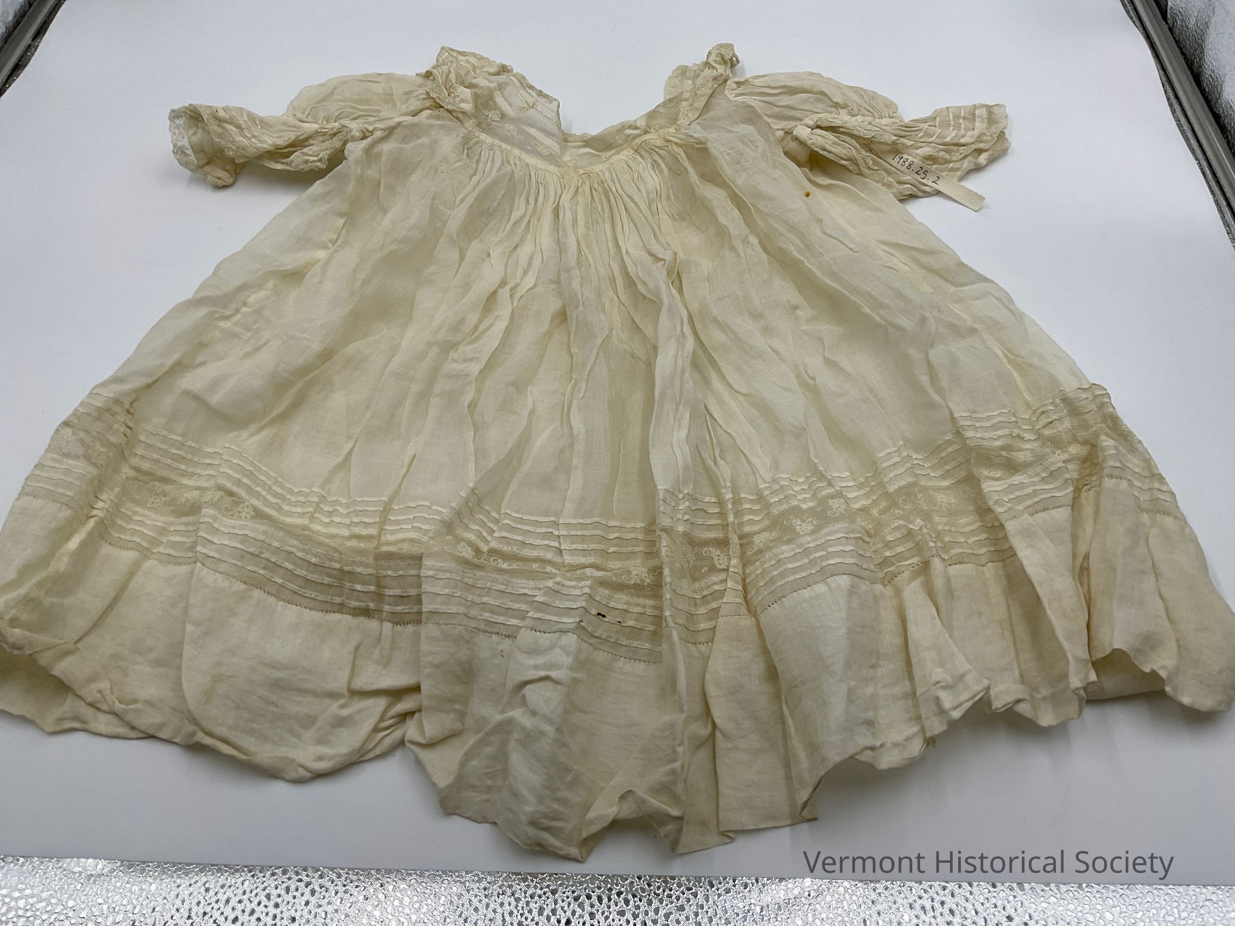 White cotton dress sized for an infant or small toddler. Is has a lace yoke and no waistline. It has shoulder ruffles atop puffy short sleeves that are also ruffled. The bottom of the dress includes narrow, horizontal pleats and a strip of lace.