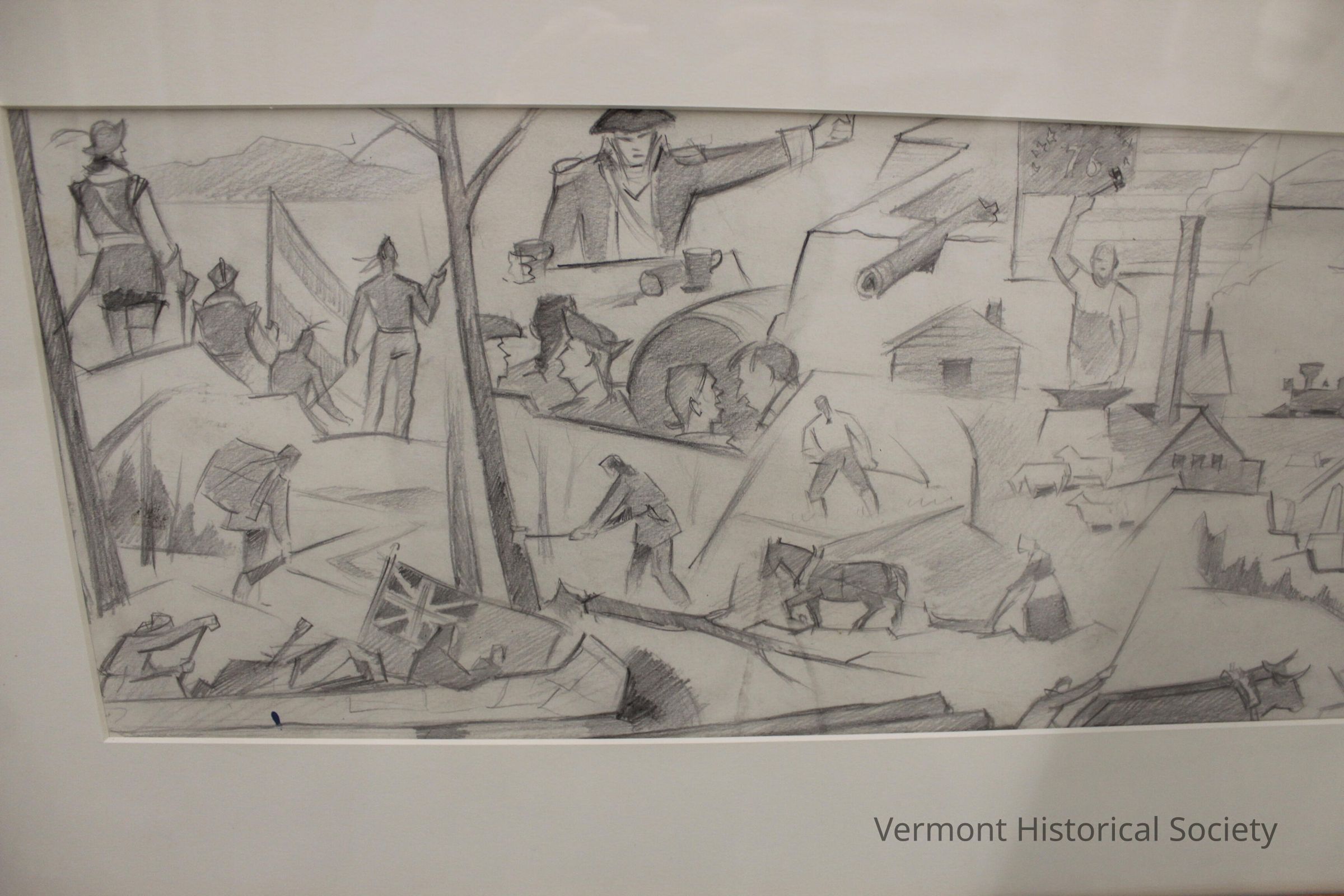 When National Life laid the cornerstone of its headquarters on the ridge overlooking Montpelier in 1958, their CEO approached well-known-muralist Paul Sample to create an iconic work of art to evoke the past, present, and future of Vermont as a centerpiece of the new structure. Sample worked closely with National Life to choose scenes and topics that reflected both Vermont's story and that of the company's rich Vermont roots. As he got closer to a final design, Sample produced scale drawings, called cartoons, of the mural in both pencil and paint for company approval. When he was ready to transfer the design to the full eight by fifty-foot canvas, he partitioned the final cartoon into numbered blocks to ease the enlargement of scenes. Notice how the composition and content of the mural changed from the bottom sketch to the top working design.