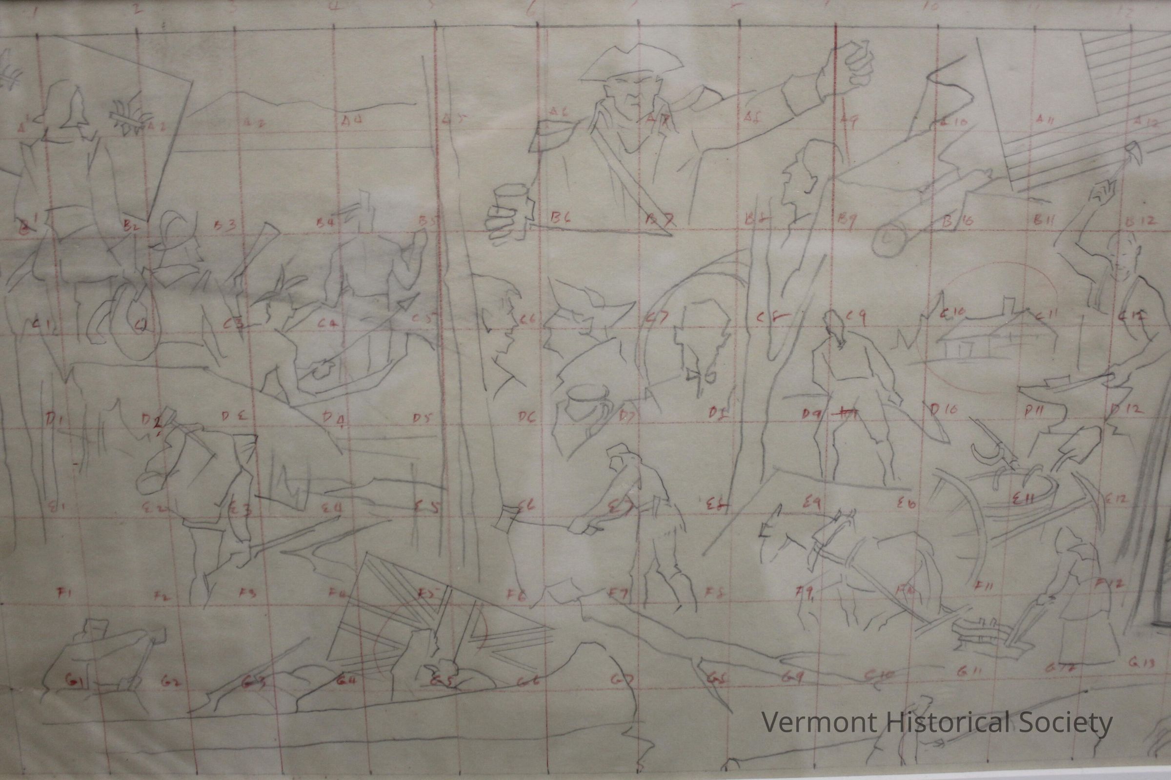 The drawing is on brown paper. On the entire picture there is a grid. Numbers line the vertical axis, they go up to 25 in red ink then start over from 1 in yellow ink. On the vertical axis there are letters up to G. When these two axis meet they create a square inch box; these boxes are all along the picture. In the far left corner there is a scene of Native Americans paddling a canoe, and to their left is supposedly Samuel de Champlain. To the right of the Native American scene is a picture of a man with his fist raised wearing a colonial hat. Below him there is a man chopping wood and two horses pulling something. To the right of these scenes the sketches get darker in shade. There is a picture of a church with hands clasped in a prayer position. To the churches right there is a picture of a man and woman holding each other. Under them is a man holding a piece of paper, and below this man is a picture of the state house. To the right of the state house there is a large scene of sap collecting. Two trees frame this scene. To the right and a bit above that scene there is the front of a building, below the building there is a group of people, some of them are waving their hands. Next to the group of people and the building, on the right, there is a tree, to the right of the tree begins a new scene. This scene is of farmers. Miking cows, taking care of horses. Above the farm scene there is a granite workers scene. A man waving his hand to another man working in the granite quarry. To the right of these two scenes is another tree. To the right of that tree, in the upper right corner is a scene of a college graduation. Below that is a drawing of people skiing.Type of Drawing