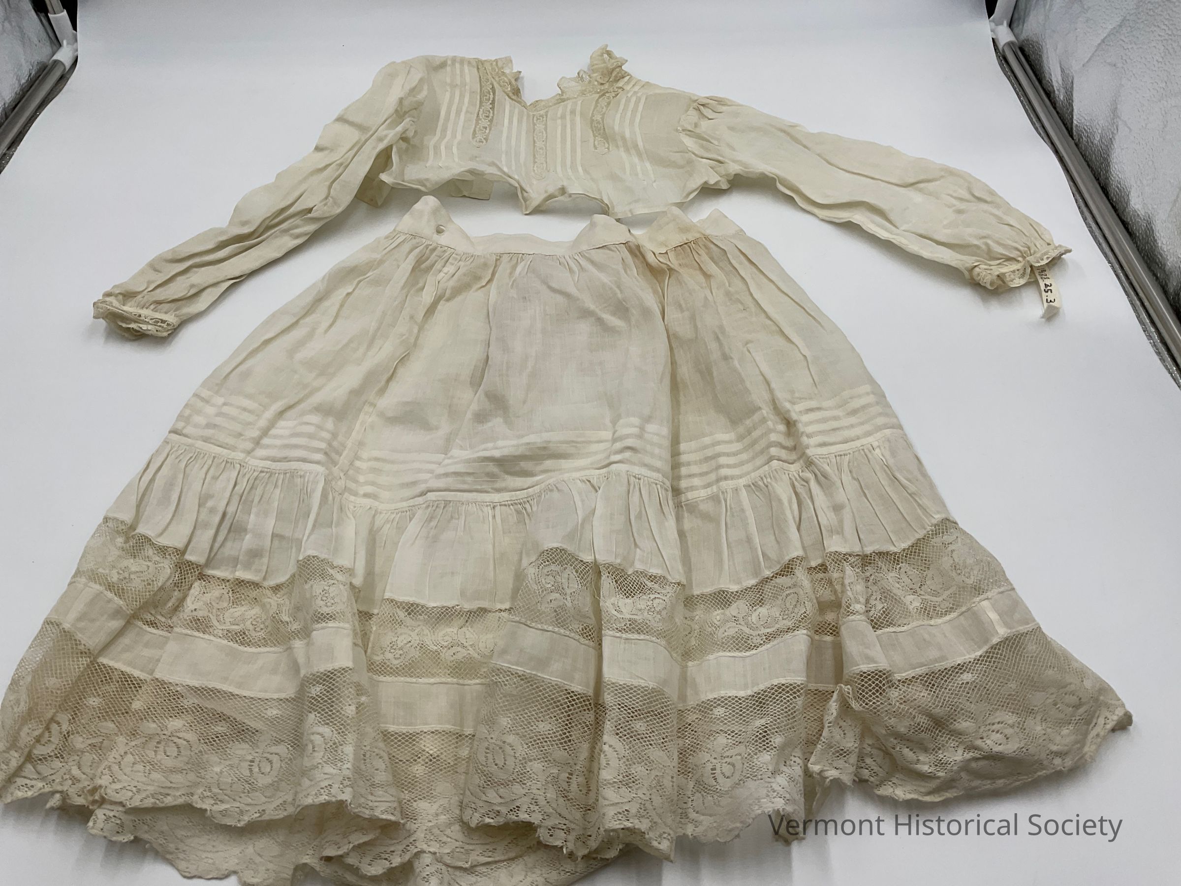 Two-piece white cotton dress for a child. The dress consists of a bodice or blouse, and a skirt. The blouse is cream-colored and long-sleeved, featuring lace details on the neck and cuffs. It has three lace panels inset in the front and two in the back. It fastens at the back with buttons. The second component is a gathered cream-colored skirt with a wide ruffle at the hem, which includes two panels of lace. It secures at the waist with a single button.Context